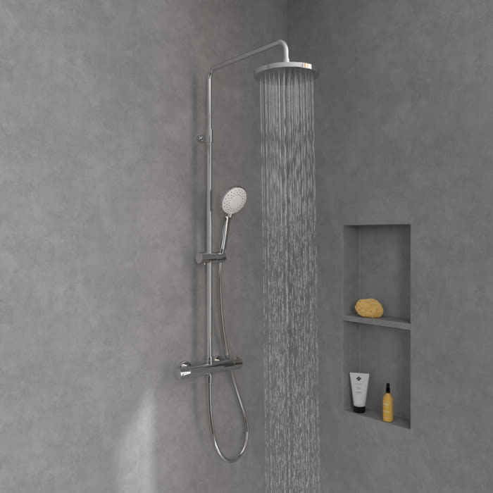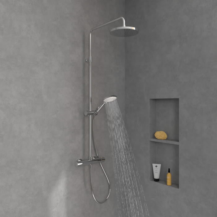 Wohlfühlen im Nassbereich? Das verspricht das hochwertige Duschsystem von Villeroy & Boch mit integrierter Hand- und Kopfbrause für die Wandmontage. Die Handbrause bietet drei unterschiedliche Strahlarten für ein optimales Duscherlebnis. Das heißt konkret Relax-, Massage- und Intensivstrahl. Es kann gewechselt werden zwischen einem gleichmäßigen und angenehmen Strahl, einem konzentrierten Strahl zur Muskelentspannung sowie einem kraftvollen Strahl mit hoher Reichweite. Selbstverständlich kann die Handbrause über den Handbrausehalter in der Höhe frei eingestellt und im passenden Winkel gekippt werden. Ein integrierter Umsteller sorgt für den einfachen Wechsel zwischen Hand- und Kopfbrause. Dank präziser und konstanter Temperaturregelung und optionaler Temperaturbegrenzung kann ganz leicht nach individuellen Wünschen geduscht werden.