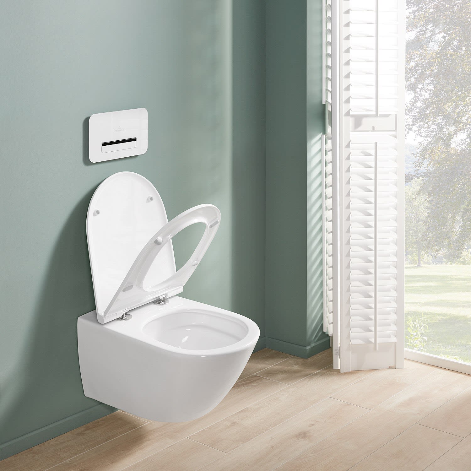 Das CombiPack Universo TwistFlush besteht aus einem wandhängenden Tiefspül-WC sowie dem passenden, sehr schmalen WC-Sitz von Villeroy & Boch. Das WC überzeugt mit einem zeitlosen Design und optimalem Spülergebnis. Denn die innovative Spültechnologie TwistFlush reinigt mit der physikalischen Kraft eines kontrolliert aufgebauten Wasserwirbels extrem hygienisch und sauber. Durch die Form des Innenbeckens, die keinerlei Ecken oder Kanten aufweist, wird die Schmutzanhaftung erschwert und die WC-Bürste nahezu überflüssig. So wird auch das Spülwasser viel effizienter genutzt, sodass 4,5 Liter für eine große und 3 Liter für eine kleine Spülung vollkommen ausreichen. Perfekt ergänzt wird das WC mit dem passenden ovalen WC-Sitz, der auch aus funktioneller Sicht punktet: Dank Absenkautomatik schließt der Deckel extrem leise und er ist für eine einfache und hygienische Reinigung schnell abnehmbar.