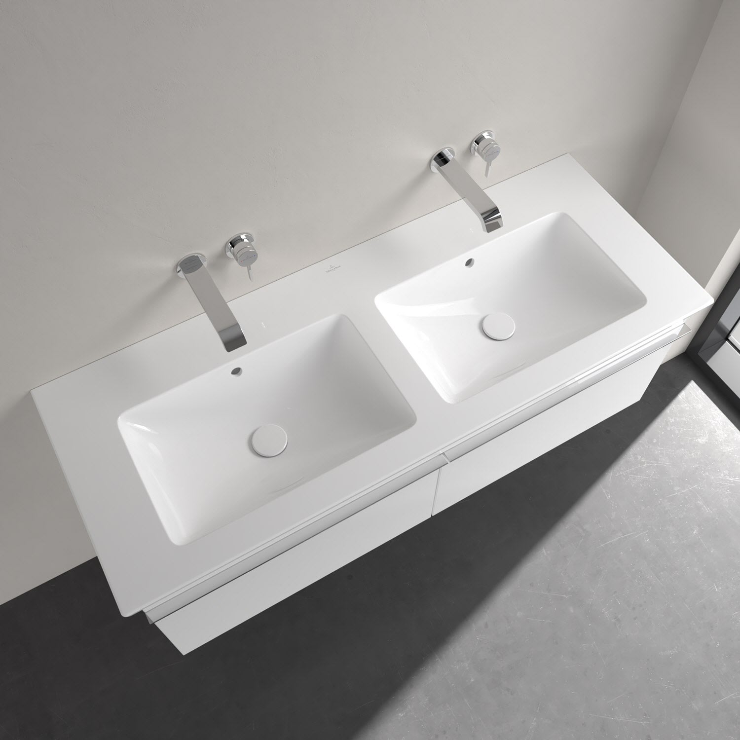 Der rechteckige Venticello Doppel-Waschtisch von Villeroy & Boch überzeugt auf ganzer Linie: sehr geradlinig und leicht im Design durch die extrem dünne Zarge. Sowohl die beiden Seiten als auch die besonders großzügige Hahnlochbank können als Ablagefläche für Seifenspender, Zahnputzbecher und andere Badutensilien genutzt werden. Dank der beiden klar abgetrennten Bereiche kommt es sicherlich nicht mehr zum Streit am Waschplatz!