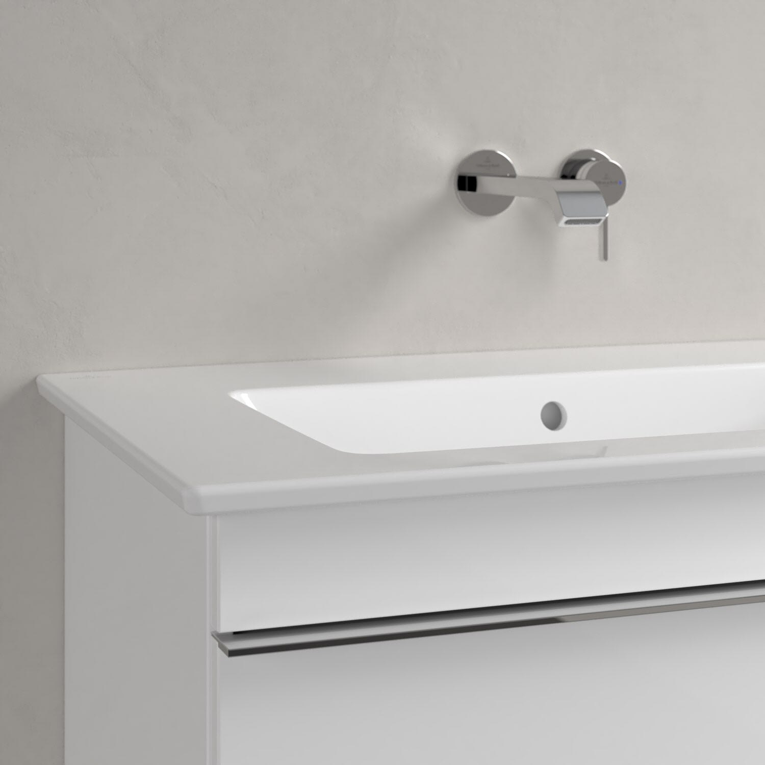 Der rechteckige Venticello Schrankwaschtisch von Villeroy & Boch überzeugt auf ganzer Linie: sehr geradlinig und leicht im Design durch die extrem dünne Zarge. Sowohl die beiden Seiten als auch die besonders großzügige Hahnlochbank können als Ablagefläche für Seifenspender, Zahnputzbecher und andere Badutensilien genutzt werden. Für ein perfektes Erscheinungsbild kann der klar gestaltete Waschtisch mit einem passenden Möbel der Kollektion Venticello ergänzt werden.