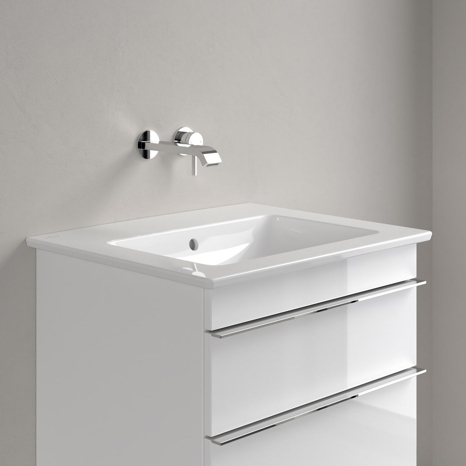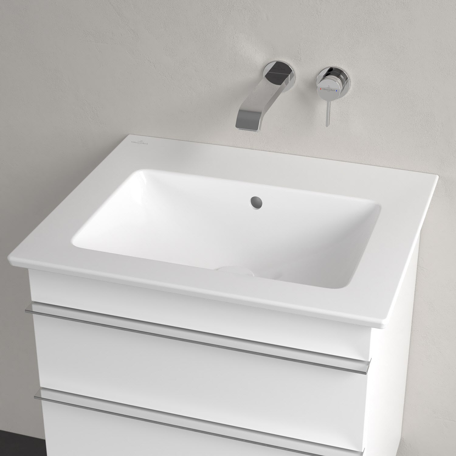 Der rechteckige Venticello Waschtisch von Villeroy & Boch überzeugt auf ganzer Linie: sehr geradlinig und leicht im Design durch die extrem dünne Zarge. Sowohl die beiden Seiten als auch die besonders großzügige Hahnlochbank können als Ablagefläche für Seifenspender, Zahnputzbecher und andere Badutensilien genutzt werden. Für ein perfektes Erscheinungsbild kann der klar gestaltete Waschtisch mit einem passenden Möbel der Kollektion Venticello ergänzt werden.