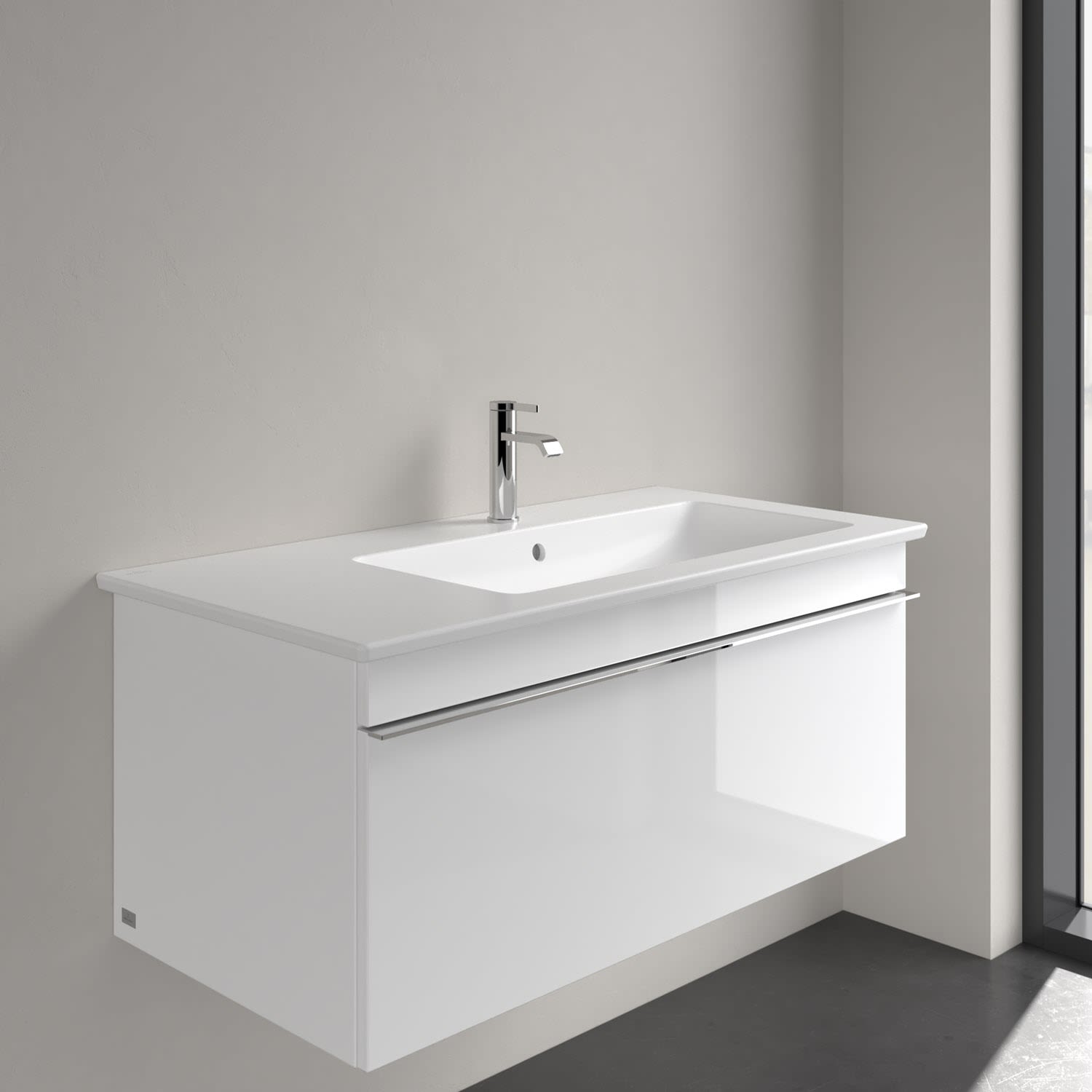 Der rechteckige Venticello Schrankwaschtisch von Villeroy & Boch überzeugt auf ganzer Linie: sehr geradlinig und leicht im Design durch die extrem dünne Zarge. Sowohl die beiden Seiten als auch die besonders großzügige Hahnlochbank können als Ablagefläche für Seifenspender, Zahnputzbecher und andere Badutensilien genutzt werden. Für ein perfektes Erscheinungsbild kann der klar gestaltete Waschtisch mit einem passenden Möbel der Kollektion Venticello ergänzt werden.