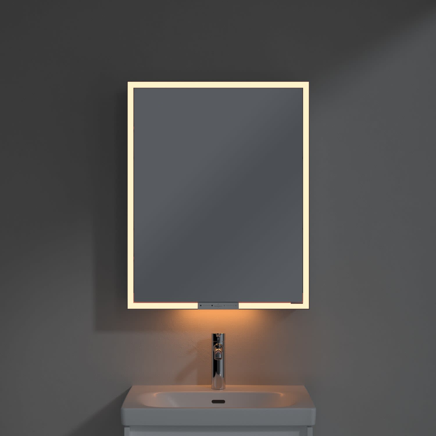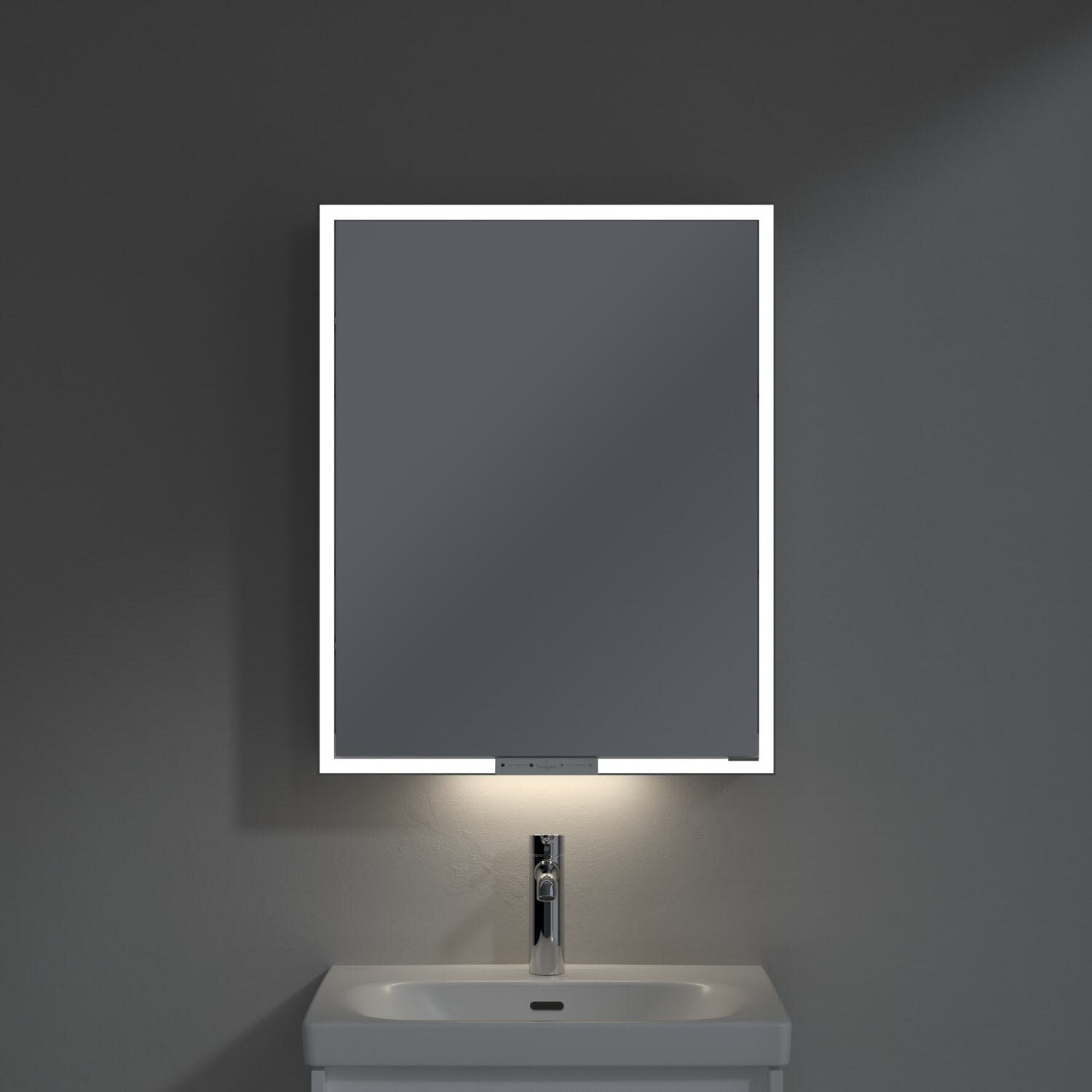 Das umlaufende LED-Lichtband sorgt für eine gleichmäßige Ausleuchtung, die integrierte Waschtischbeleuchtung und die beleuchteten offenen Fächer schaffen ein stimmungsvolles Ambiente. Helligkeit und Farbtemperatur lassen sich bequem per Sensor oder Smart-Home-Steuerung einstellen. Filigrane Griffe ermöglichen ein bequemes Öffnen der Türen ohne Fingerabdrücke, eine innenliegende Doppelsteckdose bietet zusätzliche Funktionalität.