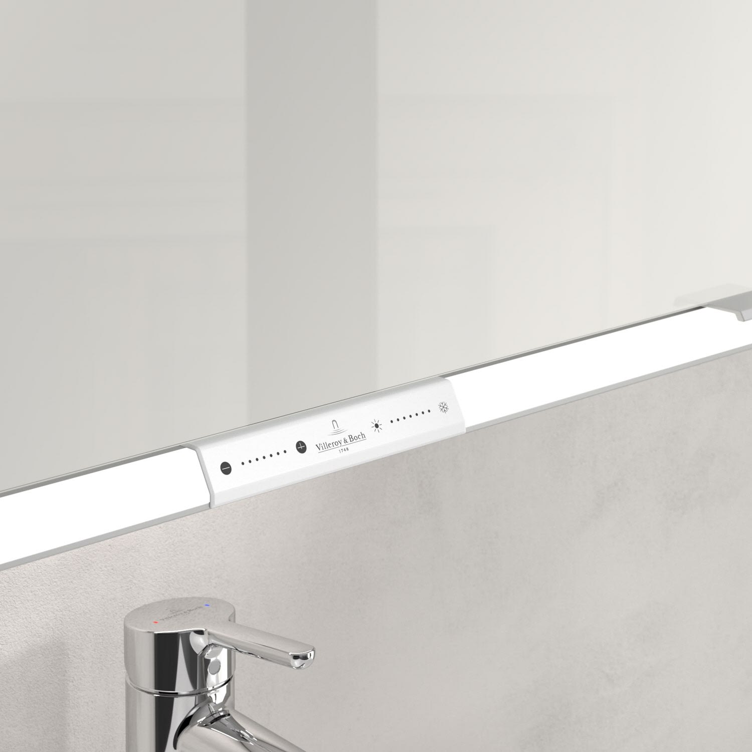 Das umlaufende LED-Lichtband sorgt für eine gleichmäßige Ausleuchtung, die integrierte Waschtischbeleuchtung und die beleuchteten offenen Fächer schaffen ein stimmungsvolles Ambiente. Helligkeit und Farbtemperatur lassen sich bequem per Sensor oder Smart-Home-Steuerung einstellen. Filigrane Griffe ermöglichen ein bequemes Öffnen der Türen ohne Fingerabdrücke, eine innenliegende Doppelsteckdose bietet zusätzliche Funktionalität.