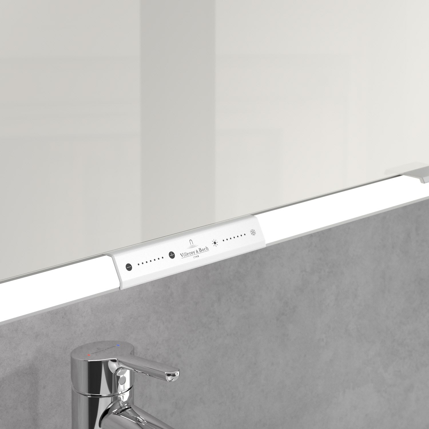 Das umlaufende LED-Lichtband sorgt für eine gleichmäßige Ausleuchtung, die integrierte Waschtischbeleuchtung und die beleuchteten offenen Fächer schaffen ein stimmungsvolles Ambiente. Helligkeit und Farbtemperatur lassen sich bequem per Sensor oder Smart-Home-Steuerung einstellen. Filigrane Griffe ermöglichen ein bequemes Öffnen der Türen ohne Fingerabdrücke, eine innenliegende Doppelsteckdose bietet zusätzliche Funktionalität.