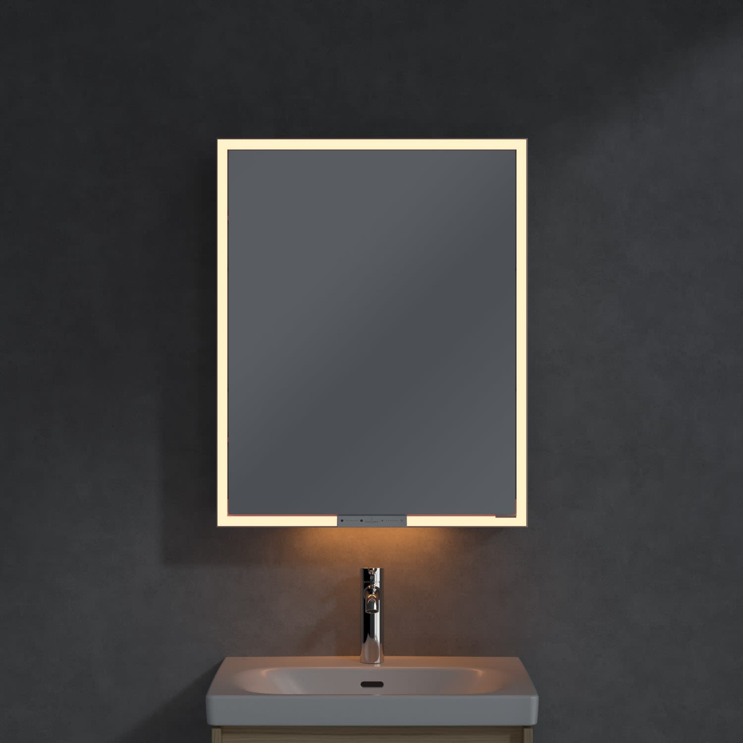 Das umlaufende LED-Lichtband sorgt für eine gleichmäßige Ausleuchtung, die integrierte Waschtischbeleuchtung und die beleuchteten offenen Fächer schaffen ein stimmungsvolles Ambiente. Helligkeit und Farbtemperatur lassen sich bequem per Sensor oder Smart-Home-Steuerung einstellen. Filigrane Griffe ermöglichen ein bequemes Öffnen der Türen ohne Fingerabdrücke, eine innenliegende Doppelsteckdose bietet zusätzliche Funktionalität.