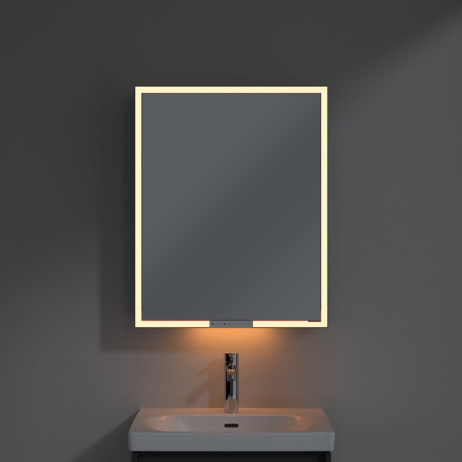 Das umlaufende LED-Lichtband sorgt für eine gleichmäßige Ausleuchtung, die integrierte Waschtischbeleuchtung und die beleuchteten offenen Fächer schaffen ein stimmungsvolles Ambiente. Helligkeit und Farbtemperatur lassen sich bequem per Sensor oder Smart-Home-Steuerung einstellen. Filigrane Griffe ermöglichen ein bequemes Öffnen der Türen ohne Fingerabdrücke, eine innenliegende Doppelsteckdose bietet zusätzliche Funktionalität.