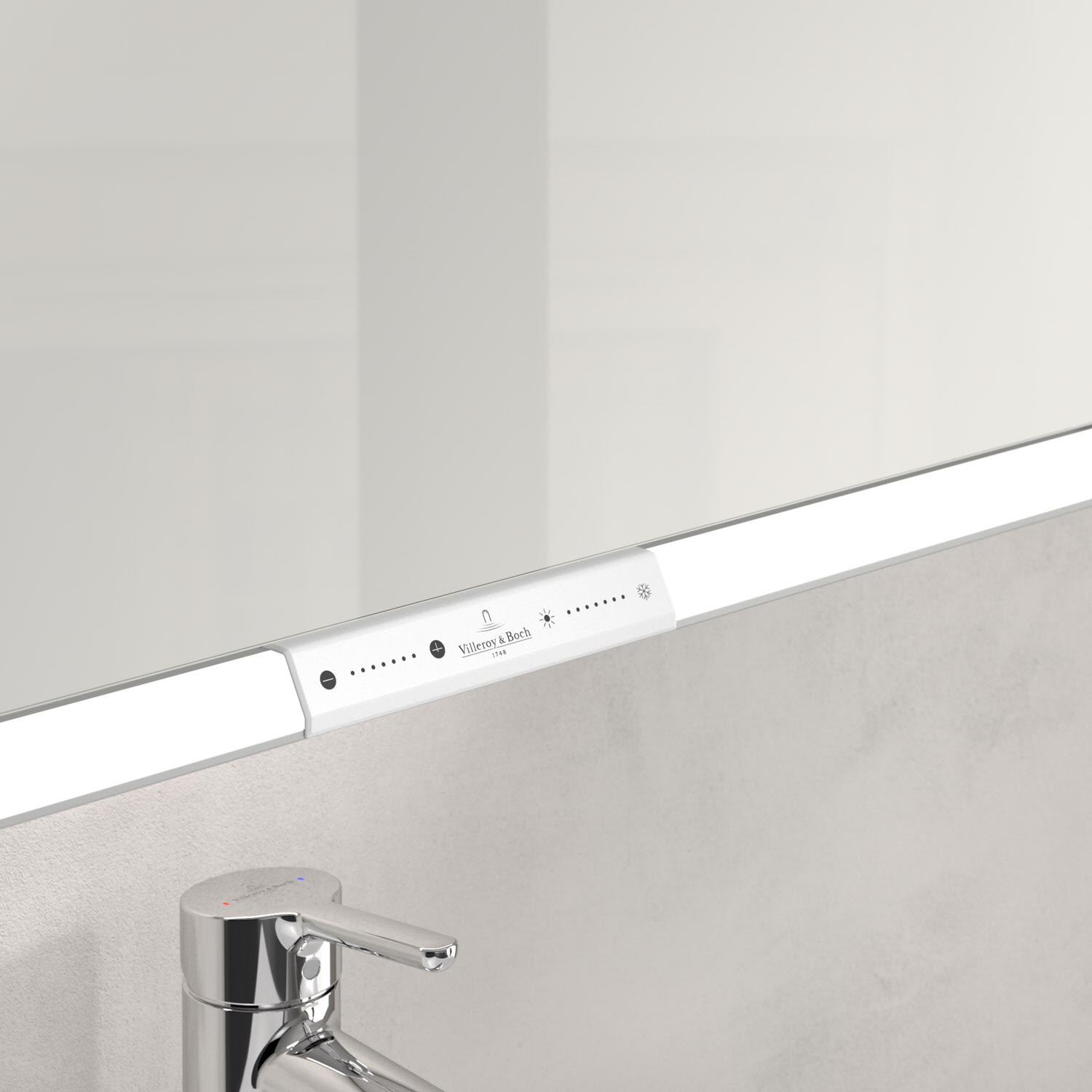 Das umlaufende LED-Lichtband sorgt für eine gleichmäßige Ausleuchtung, die integrierte Waschtischbeleuchtung und die beleuchteten offenen Fächer schaffen ein stimmungsvolles Ambiente. Helligkeit und Farbtemperatur lassen sich bequem per Sensor oder Smart-Home-Steuerung einstellen. Filigrane Griffe ermöglichen ein bequemes Öffnen der Türen ohne Fingerabdrücke, eine innenliegende Doppelsteckdose bietet zusätzliche Funktionalität.