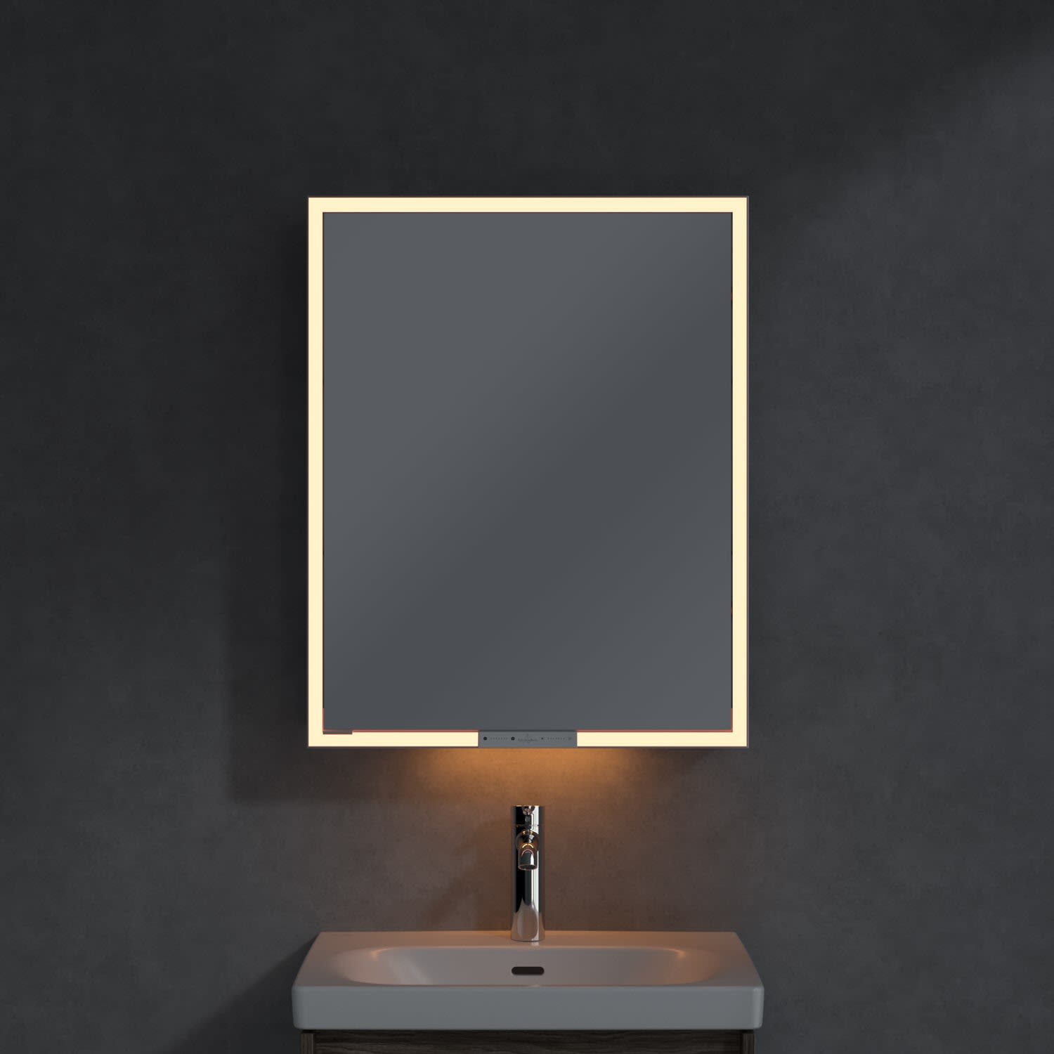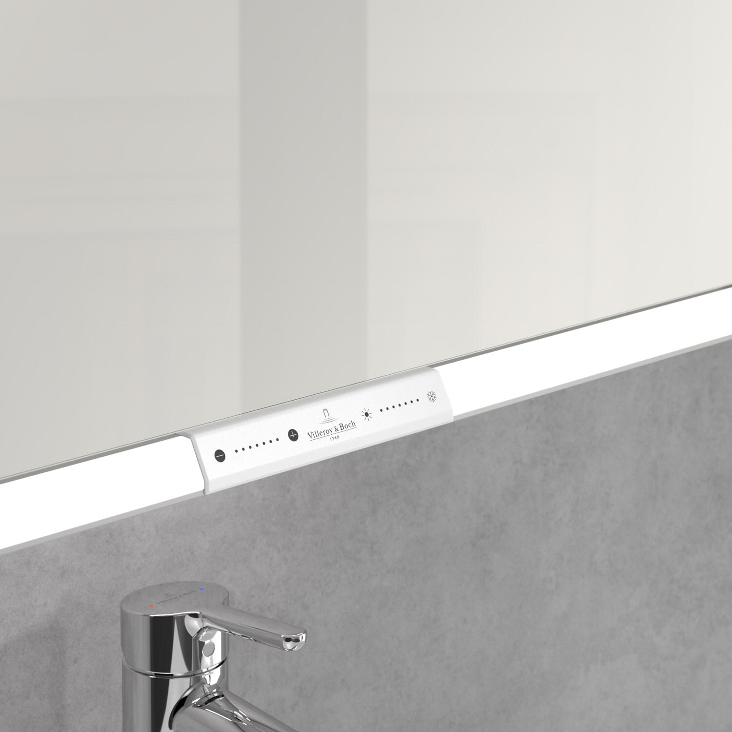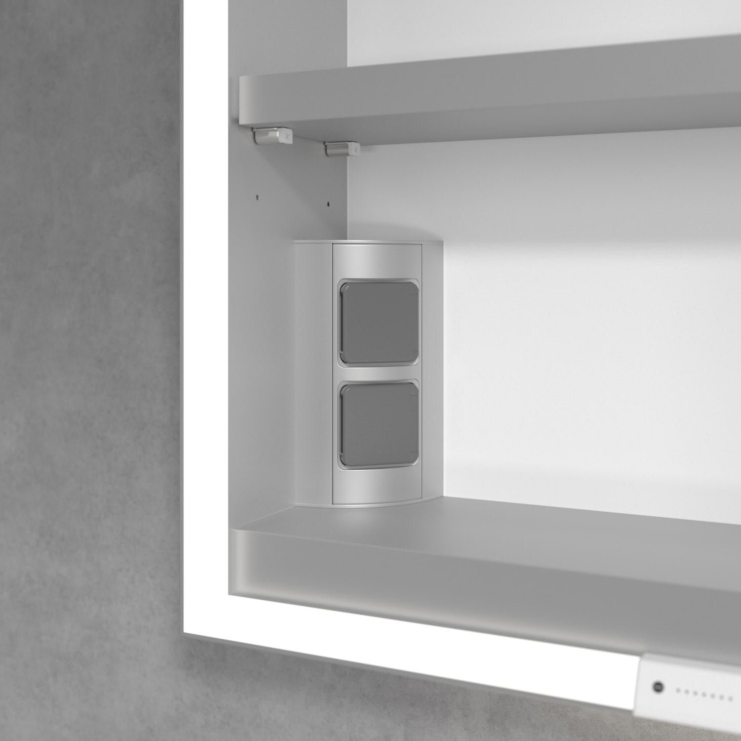 Das umlaufende LED-Lichtband sorgt für eine gleichmäßige Ausleuchtung, die integrierte Waschtischbeleuchtung und die beleuchteten offenen Fächer schaffen ein stimmungsvolles Ambiente. Helligkeit und Farbtemperatur lassen sich bequem per Sensor oder Smart-Home-Steuerung einstellen. Filigrane Griffe ermöglichen ein bequemes Öffnen der Türen ohne Fingerabdrücke, eine innenliegende Doppelsteckdose bietet zusätzliche Funktionalität.