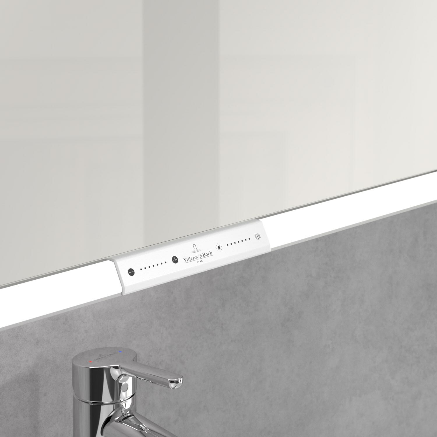 Das umlaufende LED-Lichtband sorgt für eine gleichmäßige Ausleuchtung, die integrierte Waschtischbeleuchtung und die beleuchteten offenen Fächer schaffen ein stimmungsvolles Ambiente. Helligkeit und Farbtemperatur lassen sich bequem per Sensor oder Smart-Home-Steuerung einstellen. Filigrane Griffe ermöglichen ein bequemes Öffnen der Türen ohne Fingerabdrücke, eine innenliegende Doppelsteckdose bietet zusätzliche Funktionalität.