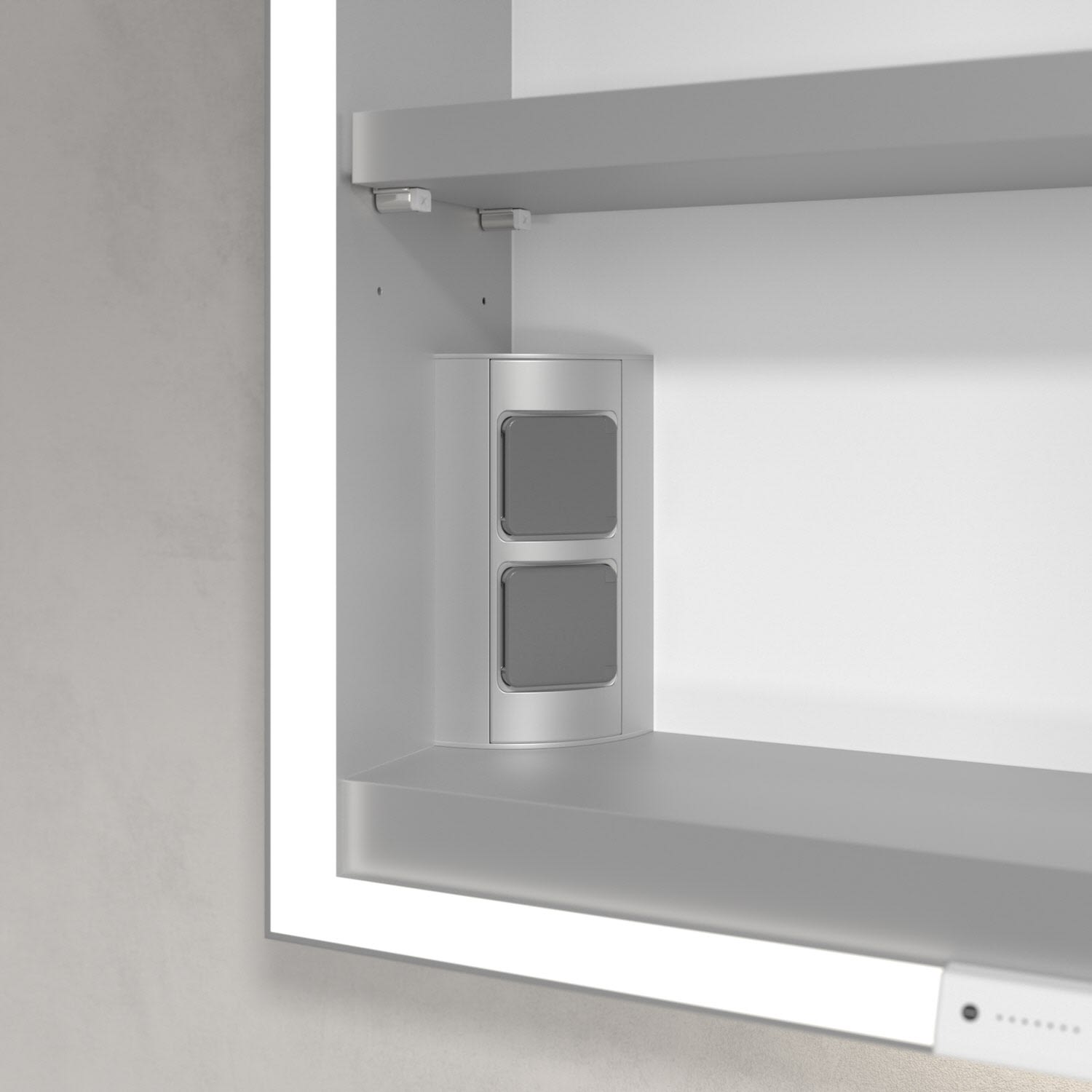 Das umlaufende LED-Lichtband sorgt für eine gleichmäßige Ausleuchtung, die integrierte Waschtischbeleuchtung und die beleuchteten offenen Fächer schaffen ein stimmungsvolles Ambiente. Helligkeit und Farbtemperatur lassen sich bequem per Sensor oder Smart-Home-Steuerung einstellen. Filigrane Griffe ermöglichen ein bequemes Öffnen der Türen ohne Fingerabdrücke, eine innenliegende Doppelsteckdose bietet zusätzliche Funktionalität.