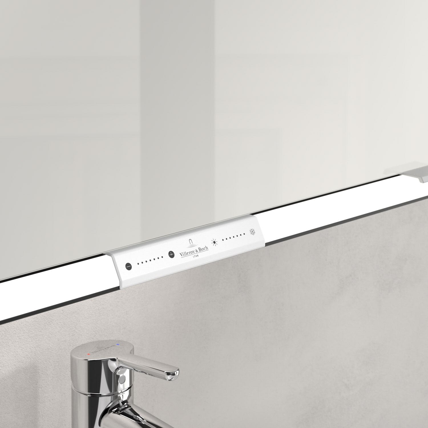 Das umlaufende LED-Lichtband sorgt für eine gleichmäßige Ausleuchtung, die integrierte Waschtischbeleuchtung und die beleuchteten offenen Fächer schaffen ein stimmungsvolles Ambiente. Helligkeit und Farbtemperatur lassen sich bequem per Sensor oder Smart-Home-Steuerung einstellen. Filigrane Griffe ermöglichen ein bequemes Öffnen der Türen ohne Fingerabdrücke, eine innenliegende Doppelsteckdose bietet zusätzliche Funktionalität.