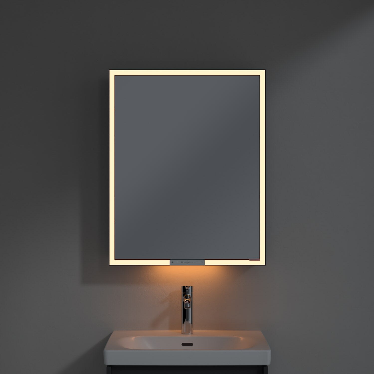 Das umlaufende LED-Lichtband sorgt für eine gleichmäßige Ausleuchtung, die integrierte Waschtischbeleuchtung und die beleuchteten offenen Fächer schaffen ein stimmungsvolles Ambiente. Helligkeit und Farbtemperatur lassen sich bequem per Sensor oder Smart-Home-Steuerung einstellen. Filigrane Griffe ermöglichen ein bequemes Öffnen der Türen ohne Fingerabdrücke, eine innenliegende Doppelsteckdose bietet zusätzliche Funktionalität.