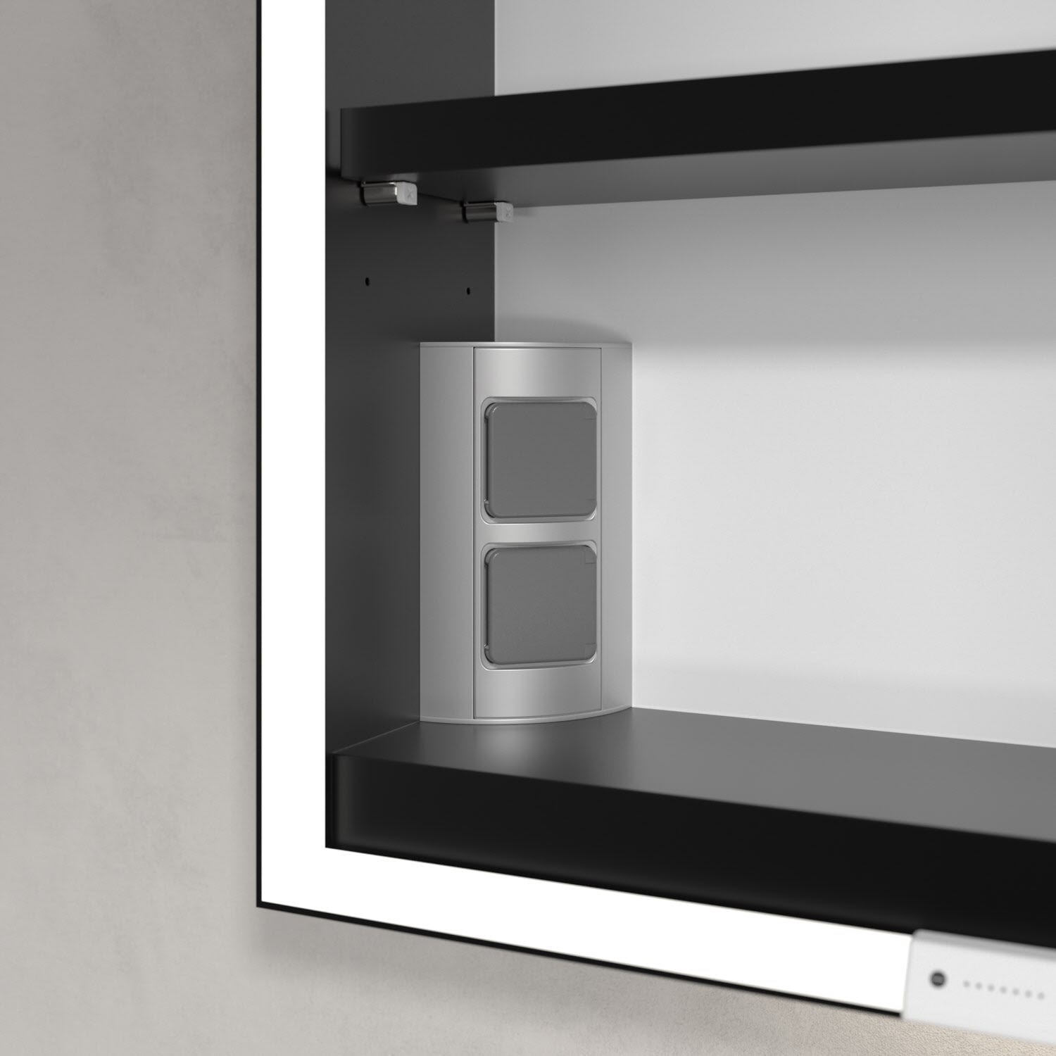 Das umlaufende LED-Lichtband sorgt für eine gleichmäßige Ausleuchtung, die integrierte Waschtischbeleuchtung und die beleuchteten offenen Fächer schaffen ein stimmungsvolles Ambiente. Helligkeit und Farbtemperatur lassen sich bequem per Sensor oder Smart-Home-Steuerung einstellen. Filigrane Griffe ermöglichen ein bequemes Öffnen der Türen ohne Fingerabdrücke, eine innenliegende Doppelsteckdose bietet zusätzliche Funktionalität.