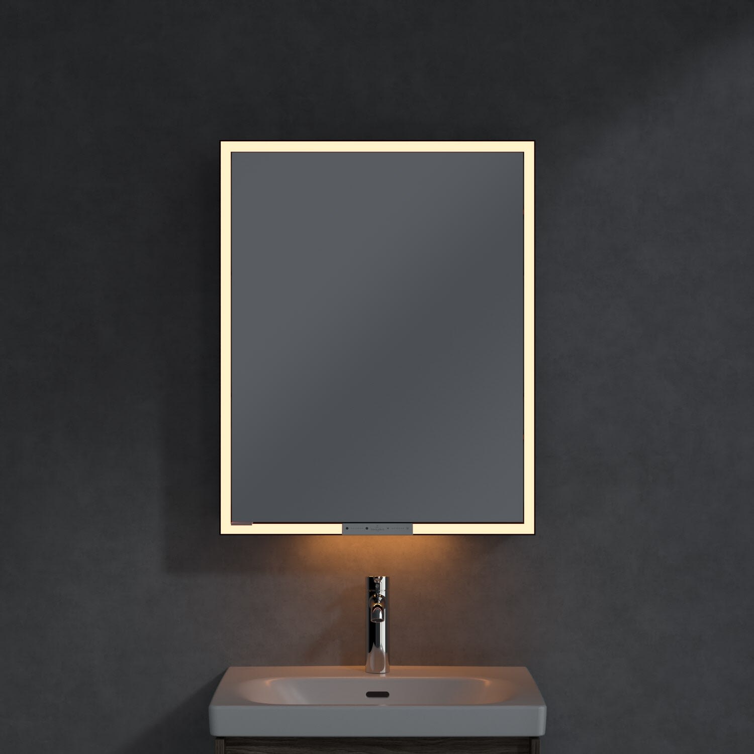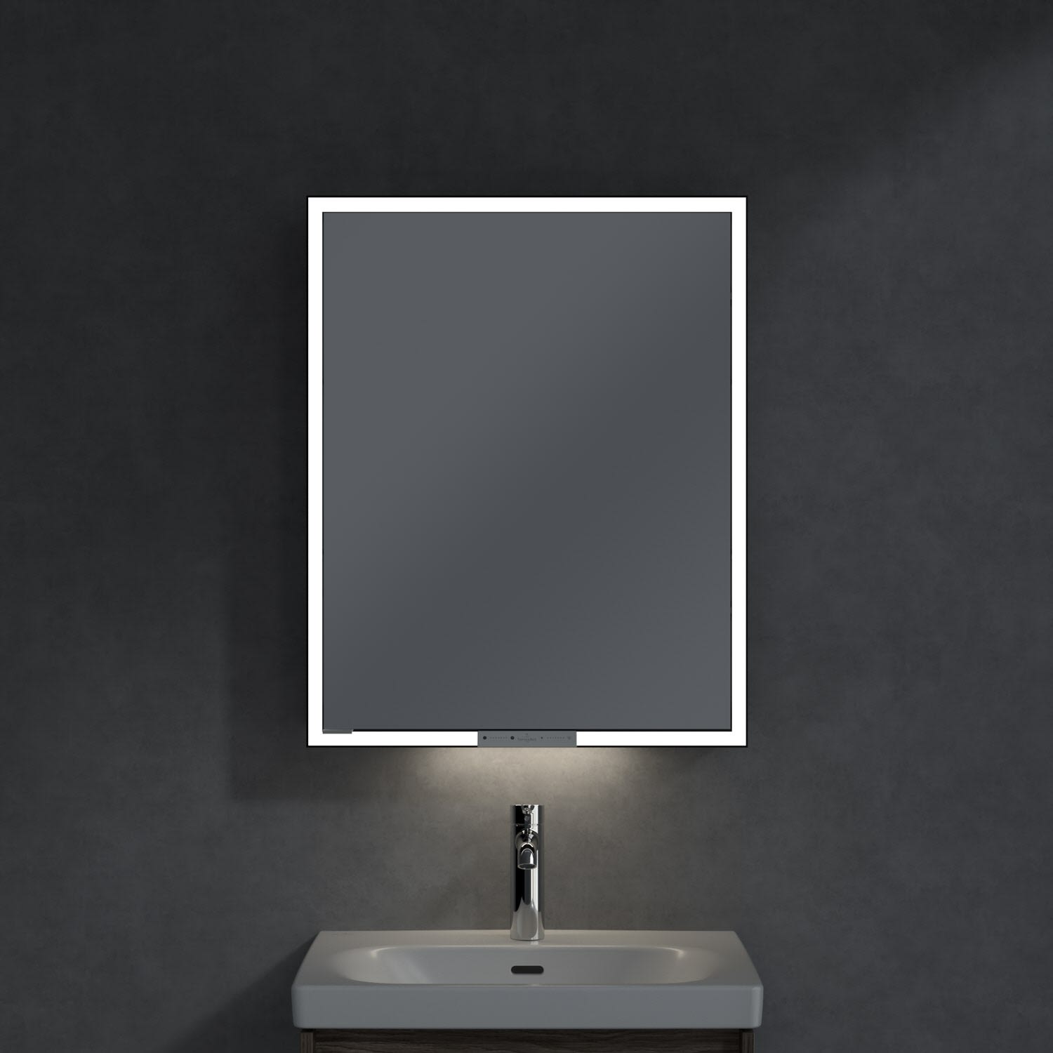 Das umlaufende LED-Lichtband sorgt für eine gleichmäßige Ausleuchtung, die integrierte Waschtischbeleuchtung und die beleuchteten offenen Fächer schaffen ein stimmungsvolles Ambiente. Helligkeit und Farbtemperatur lassen sich bequem per Sensor oder Smart-Home-Steuerung einstellen. Filigrane Griffe ermöglichen ein bequemes Öffnen der Türen ohne Fingerabdrücke, eine innenliegende Doppelsteckdose bietet zusätzliche Funktionalität.