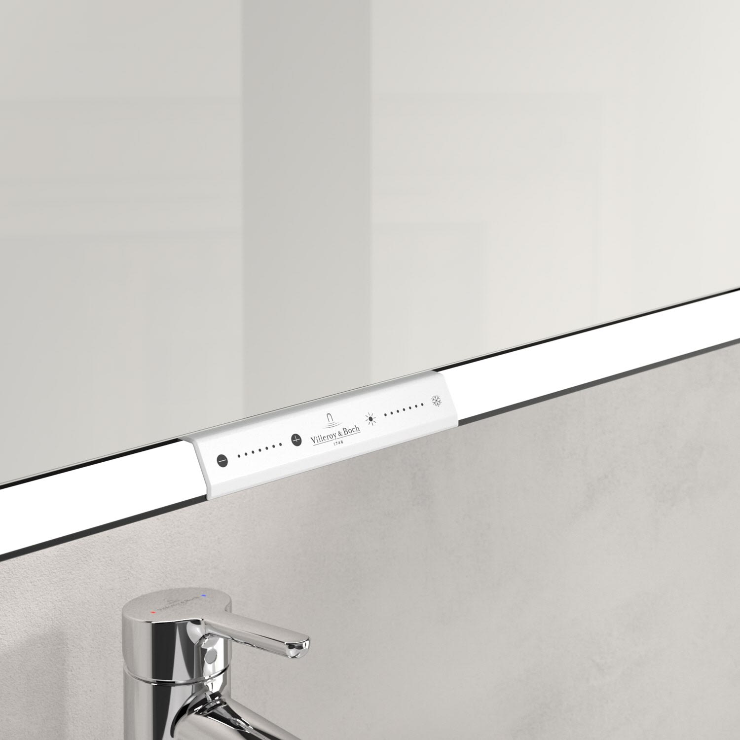 Das umlaufende LED-Lichtband sorgt für eine gleichmäßige Ausleuchtung, die integrierte Waschtischbeleuchtung und die beleuchteten offenen Fächer schaffen ein stimmungsvolles Ambiente. Helligkeit und Farbtemperatur lassen sich bequem per Sensor oder Smart-Home-Steuerung einstellen. Filigrane Griffe ermöglichen ein bequemes Öffnen der Türen ohne Fingerabdrücke, eine innenliegende Doppelsteckdose bietet zusätzliche Funktionalität.