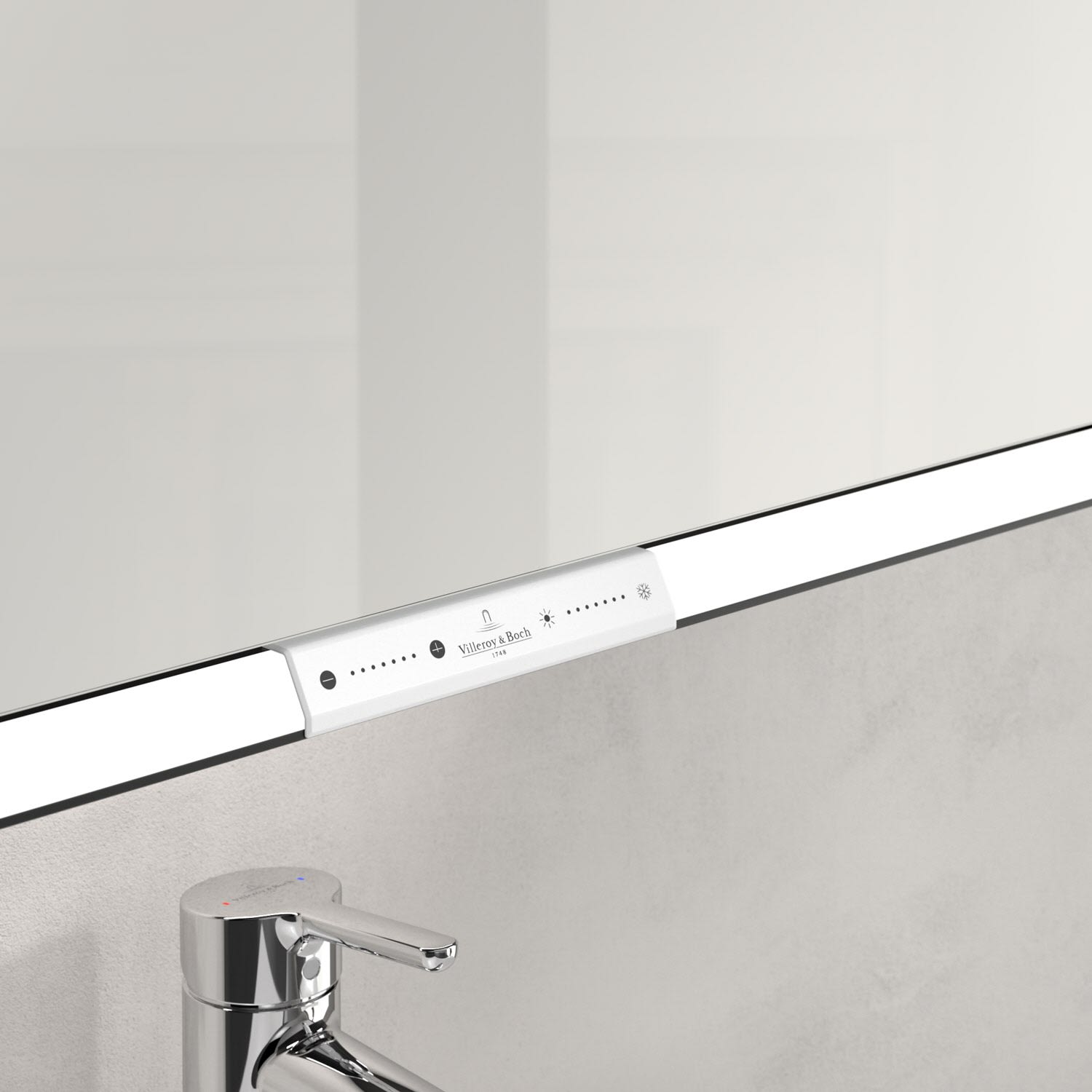 Das umlaufende LED-Lichtband sorgt für eine gleichmäßige Ausleuchtung, die integrierte Waschtischbeleuchtung und die beleuchteten offenen Fächer schaffen ein stimmungsvolles Ambiente. Helligkeit und Farbtemperatur lassen sich bequem per Sensor oder Smart-Home-Steuerung einstellen. Filigrane Griffe ermöglichen ein bequemes Öffnen der Türen ohne Fingerabdrücke, eine innenliegende Doppelsteckdose bietet zusätzliche Funktionalität.