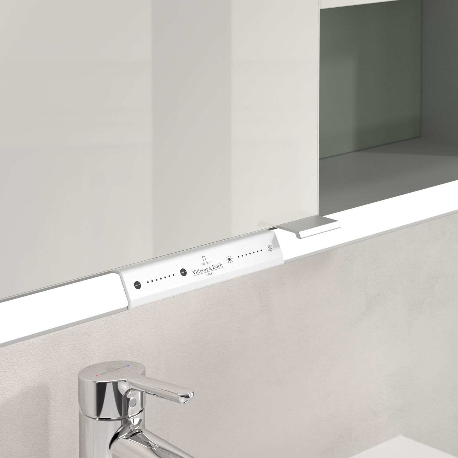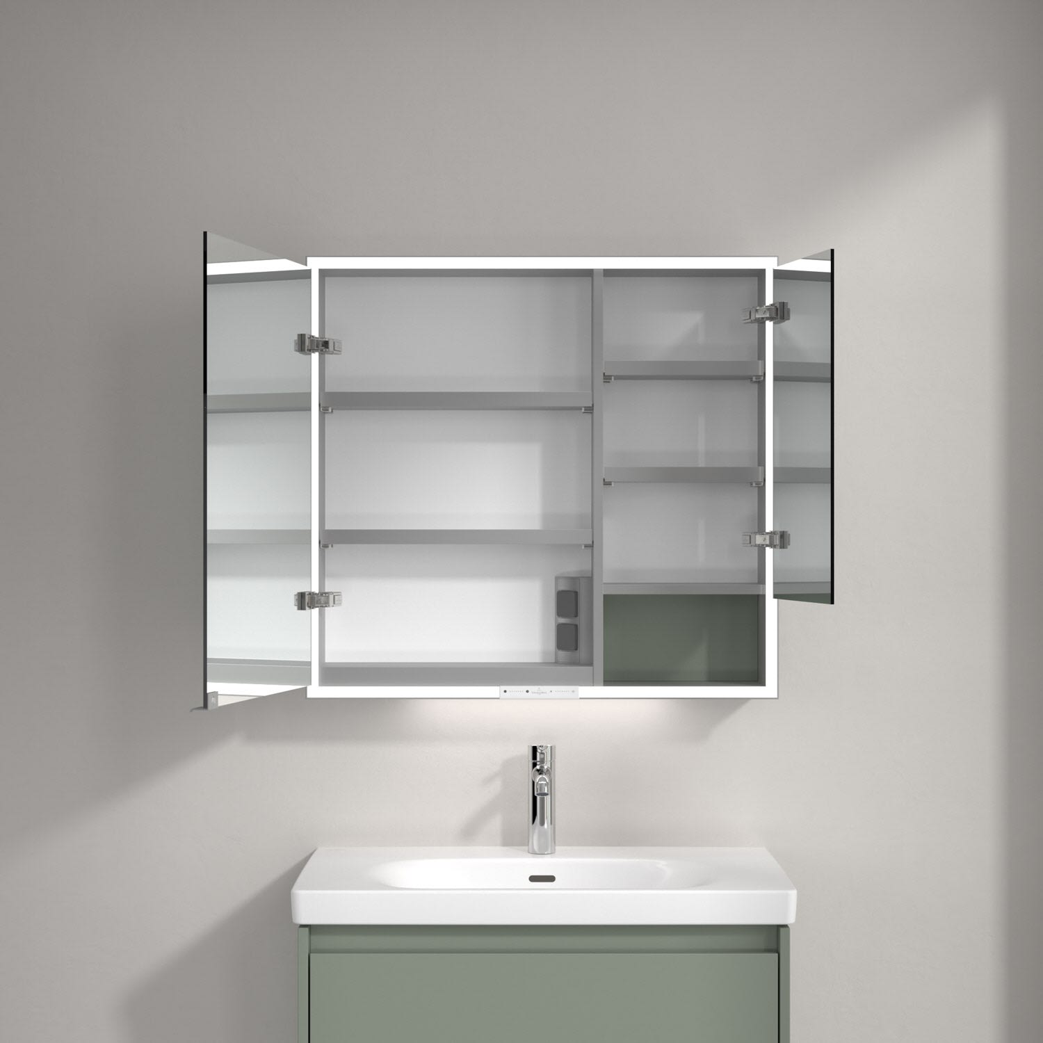 Das umlaufende LED-Lichtband sorgt für eine gleichmäßige Ausleuchtung, die integrierte Waschtischbeleuchtung und die beleuchteten offenen Fächer schaffen ein stimmungsvolles Ambiente. Helligkeit und Farbtemperatur lassen sich bequem per Sensor oder Smart-Home-Steuerung einstellen. Filigrane Griffe ermöglichen ein bequemes Öffnen der Türen ohne Fingerabdrücke, eine innenliegende Doppelsteckdose bietet zusätzliche Funktionalität.