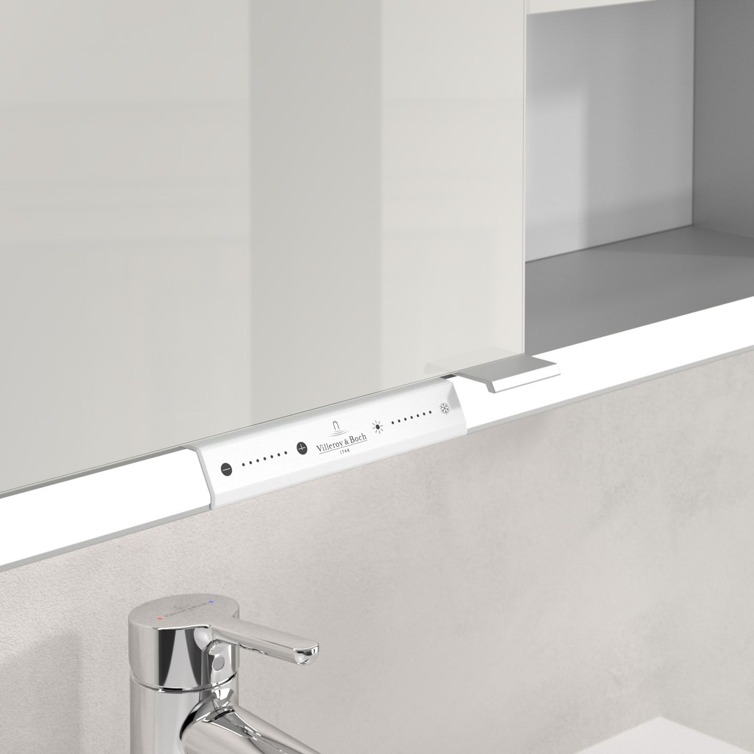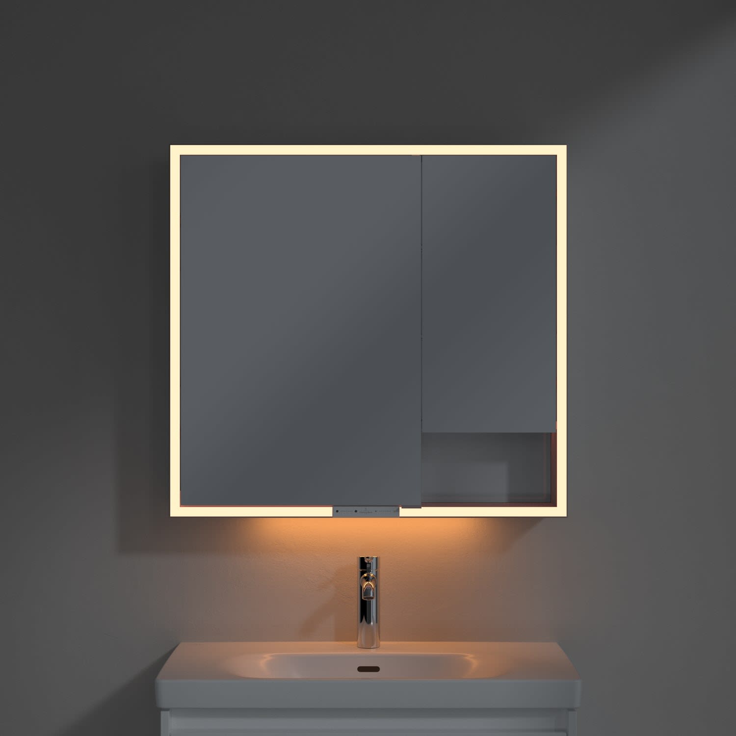 Das umlaufende LED-Lichtband sorgt für eine gleichmäßige Ausleuchtung, die integrierte Waschtischbeleuchtung und die beleuchteten offenen Fächer schaffen ein stimmungsvolles Ambiente. Helligkeit und Farbtemperatur lassen sich bequem per Sensor oder Smart-Home-Steuerung einstellen. Filigrane Griffe ermöglichen ein bequemes Öffnen der Türen ohne Fingerabdrücke, eine innenliegende Doppelsteckdose bietet zusätzliche Funktionalität.