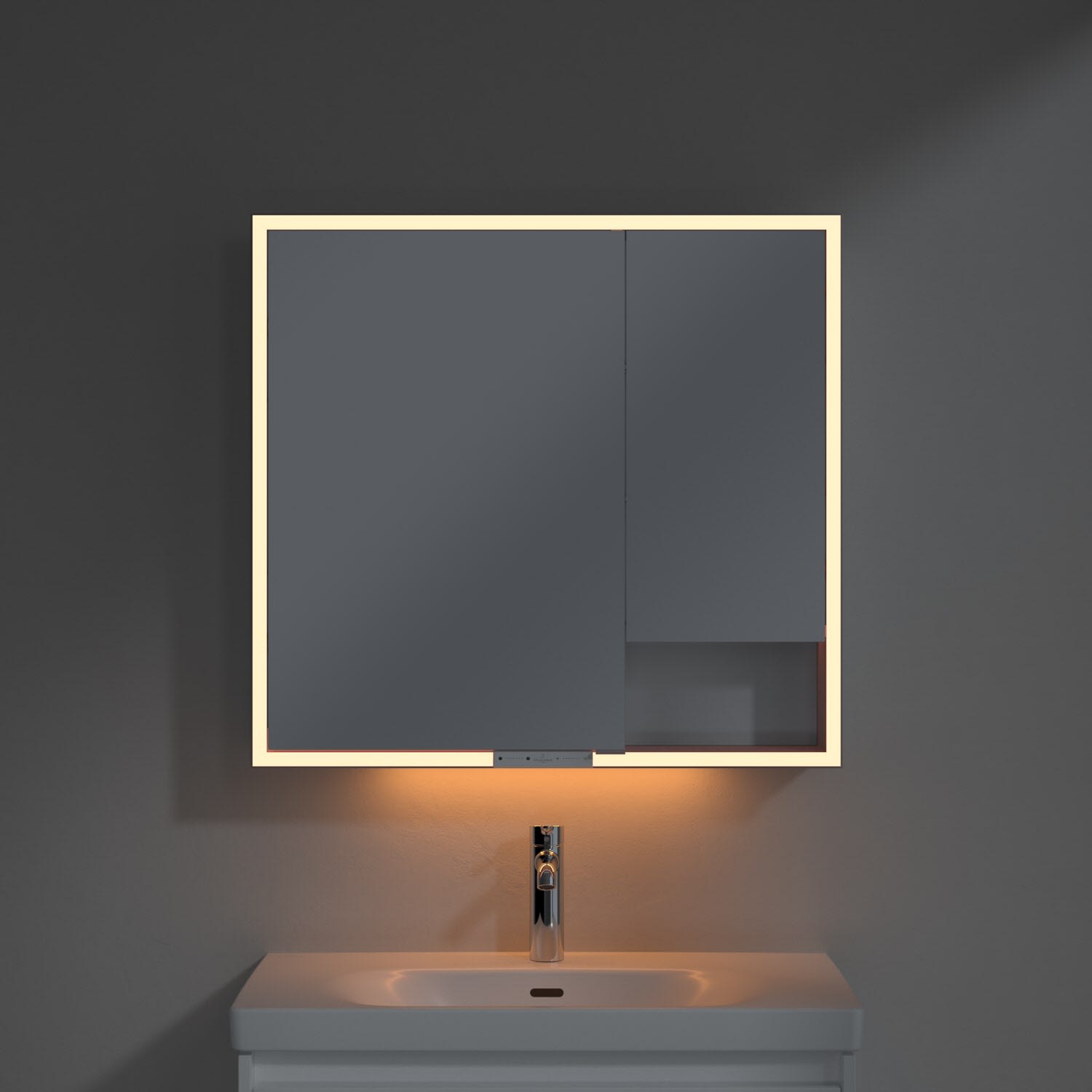 Das umlaufende LED-Lichtband sorgt für eine gleichmäßige Ausleuchtung, die integrierte Waschtischbeleuchtung und die beleuchteten offenen Fächer schaffen ein stimmungsvolles Ambiente. Helligkeit und Farbtemperatur lassen sich bequem per Sensor oder Smart-Home-Steuerung einstellen. Filigrane Griffe ermöglichen ein bequemes Öffnen der Türen ohne Fingerabdrücke, eine innenliegende Doppelsteckdose bietet zusätzliche Funktionalität.