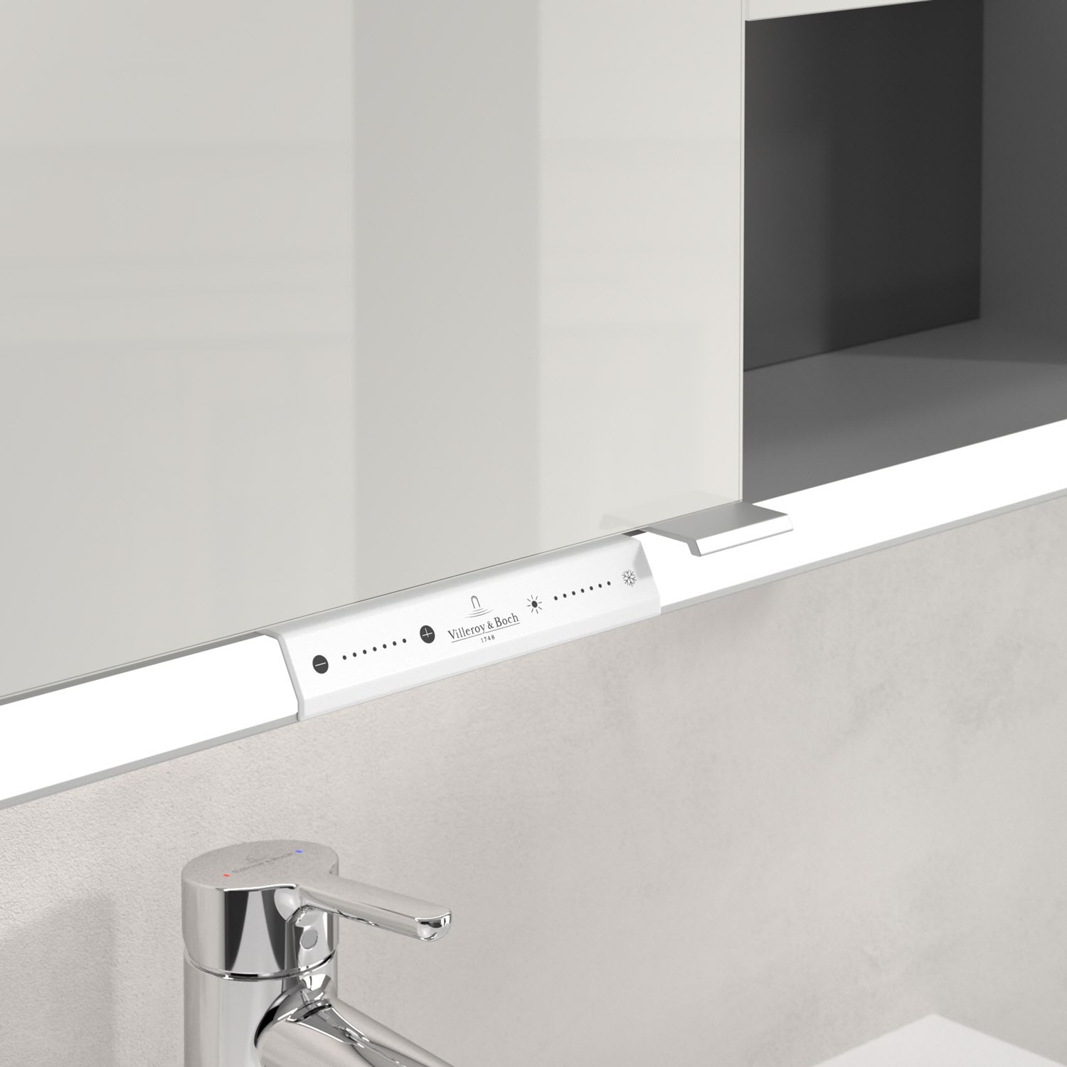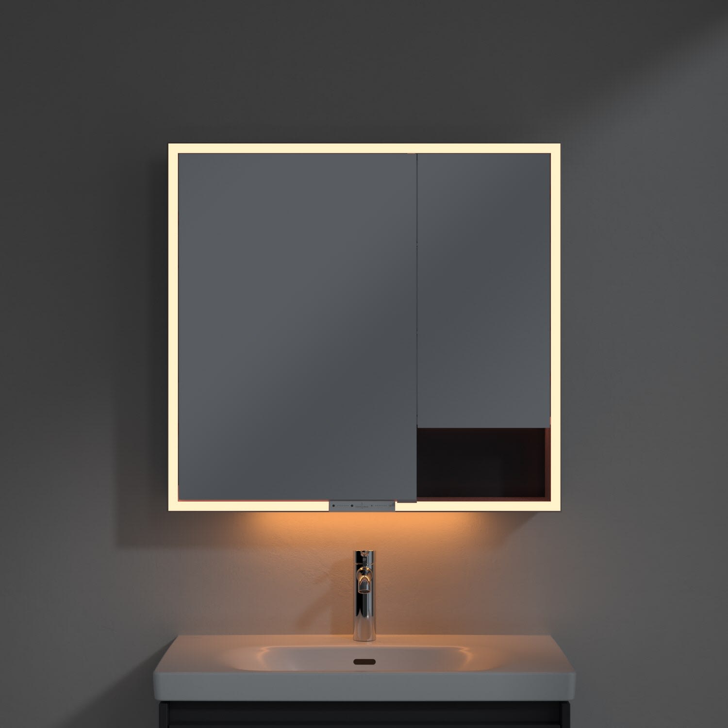 Das umlaufende LED-Lichtband sorgt für eine gleichmäßige Ausleuchtung, die integrierte Waschtischbeleuchtung und die beleuchteten offenen Fächer schaffen ein stimmungsvolles Ambiente. Helligkeit und Farbtemperatur lassen sich bequem per Sensor oder Smart-Home-Steuerung einstellen. Filigrane Griffe ermöglichen ein bequemes Öffnen der Türen ohne Fingerabdrücke, eine innenliegende Doppelsteckdose bietet zusätzliche Funktionalität.