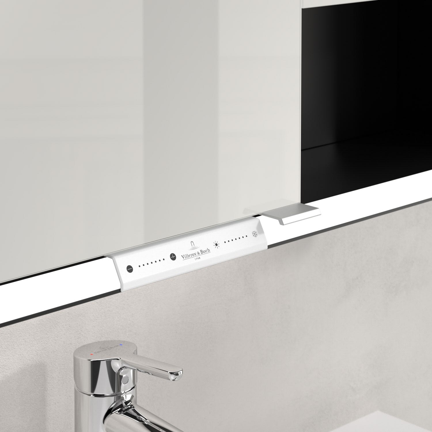 Das umlaufende LED-Lichtband sorgt für eine gleichmäßige Ausleuchtung, die integrierte Waschtischbeleuchtung und die beleuchteten offenen Fächer schaffen ein stimmungsvolles Ambiente. Helligkeit und Farbtemperatur lassen sich bequem per Sensor oder Smart-Home-Steuerung einstellen. Filigrane Griffe ermöglichen ein bequemes Öffnen der Türen ohne Fingerabdrücke, eine innenliegende Doppelsteckdose bietet zusätzliche Funktionalität.