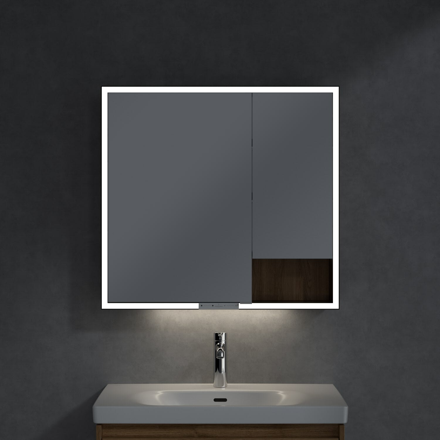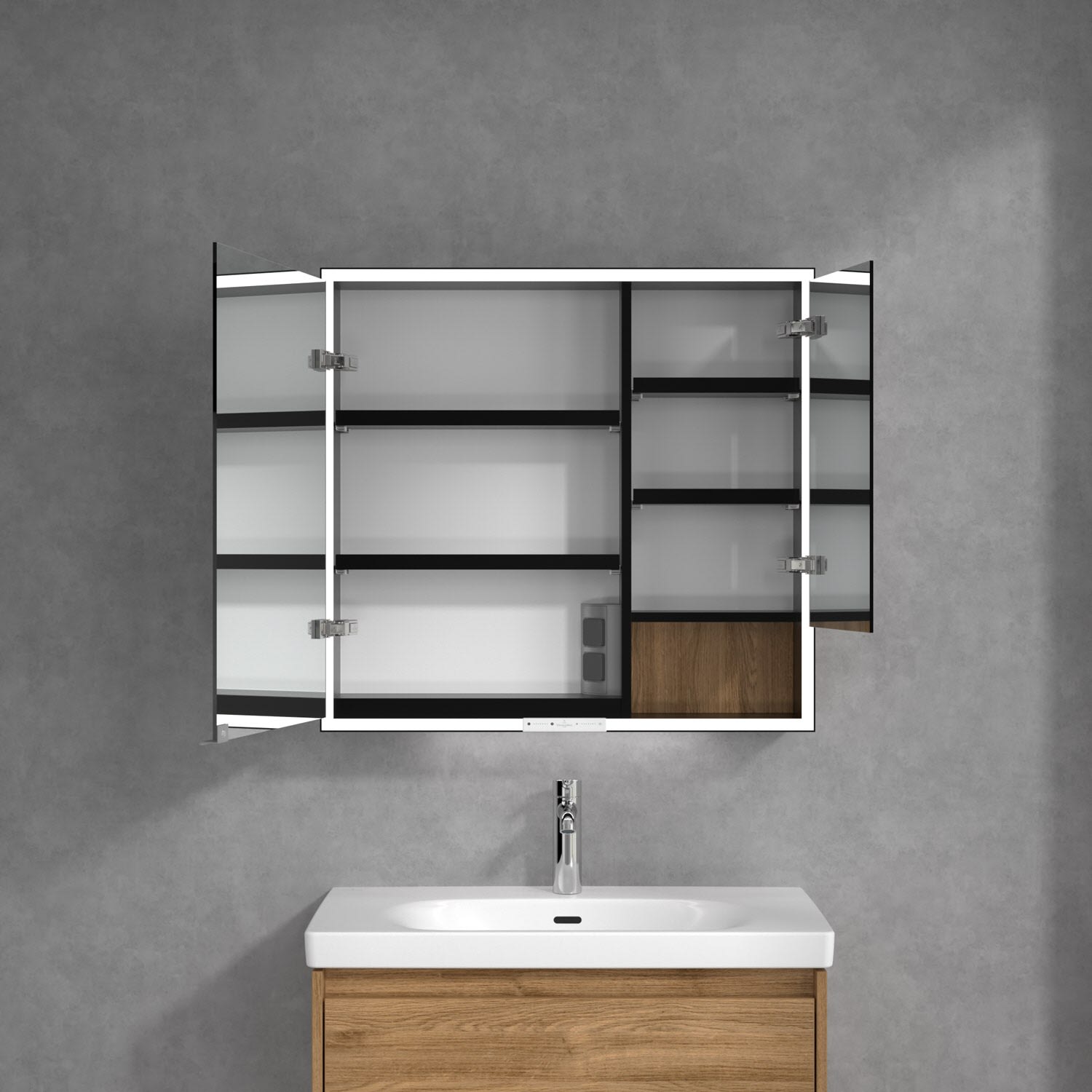 Das umlaufende LED-Lichtband sorgt für eine gleichmäßige Ausleuchtung, die integrierte Waschtischbeleuchtung und die beleuchteten offenen Fächer schaffen ein stimmungsvolles Ambiente. Helligkeit und Farbtemperatur lassen sich bequem per Sensor oder Smart-Home-Steuerung einstellen. Filigrane Griffe ermöglichen ein bequemes Öffnen der Türen ohne Fingerabdrücke, eine innenliegende Doppelsteckdose bietet zusätzliche Funktionalität.