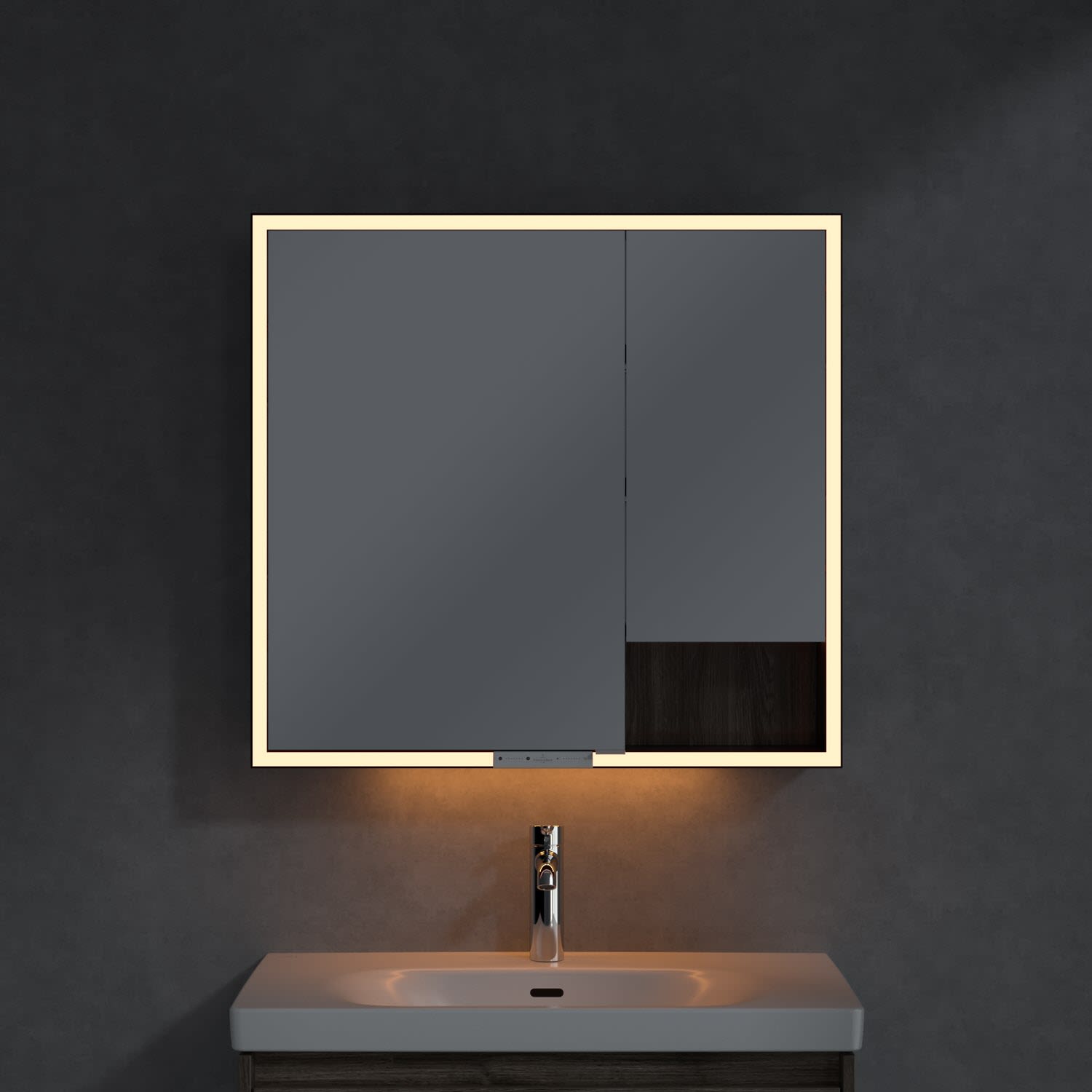 Das umlaufende LED-Lichtband sorgt für eine gleichmäßige Ausleuchtung, die integrierte Waschtischbeleuchtung und die beleuchteten offenen Fächer schaffen ein stimmungsvolles Ambiente. Helligkeit und Farbtemperatur lassen sich bequem per Sensor oder Smart-Home-Steuerung einstellen. Filigrane Griffe ermöglichen ein bequemes Öffnen der Türen ohne Fingerabdrücke, eine innenliegende Doppelsteckdose bietet zusätzliche Funktionalität.
