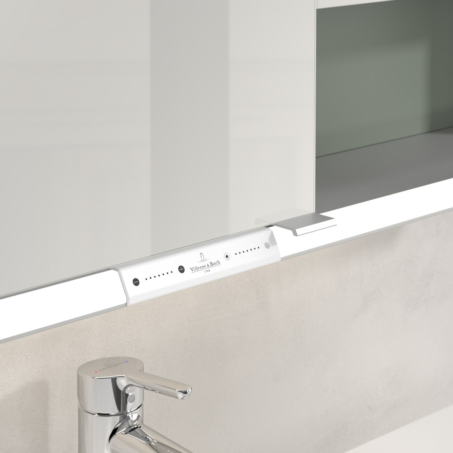 Das umlaufende LED-Lichtband sorgt für eine gleichmäßige Ausleuchtung, die integrierte Waschtischbeleuchtung und die beleuchteten offenen Fächer schaffen ein stimmungsvolles Ambiente. Helligkeit und Farbtemperatur lassen sich bequem per Sensor oder Smart-Home-Steuerung einstellen. Filigrane Griffe ermöglichen ein bequemes Öffnen der Türen ohne Fingerabdrücke, eine innenliegende Doppelsteckdose bietet zusätzliche Funktionalität.