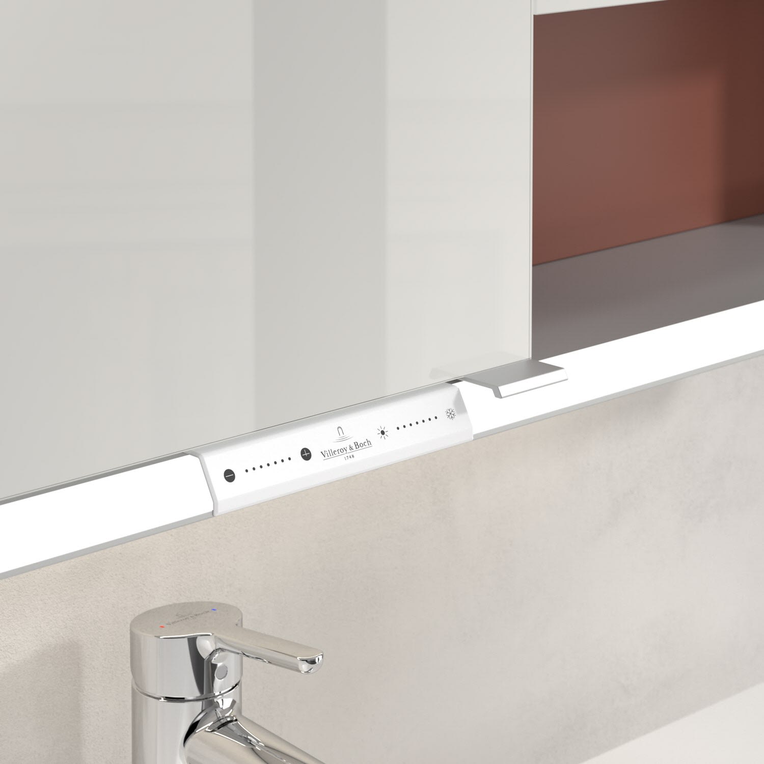 Das umlaufende LED-Lichtband sorgt für eine gleichmäßige Ausleuchtung, die integrierte Waschtischbeleuchtung und die beleuchteten offenen Fächer schaffen ein stimmungsvolles Ambiente. Helligkeit und Farbtemperatur lassen sich bequem per Sensor oder Smart-Home-Steuerung einstellen. Filigrane Griffe ermöglichen ein bequemes Öffnen der Türen ohne Fingerabdrücke, eine innenliegende Doppelsteckdose bietet zusätzliche Funktionalität.