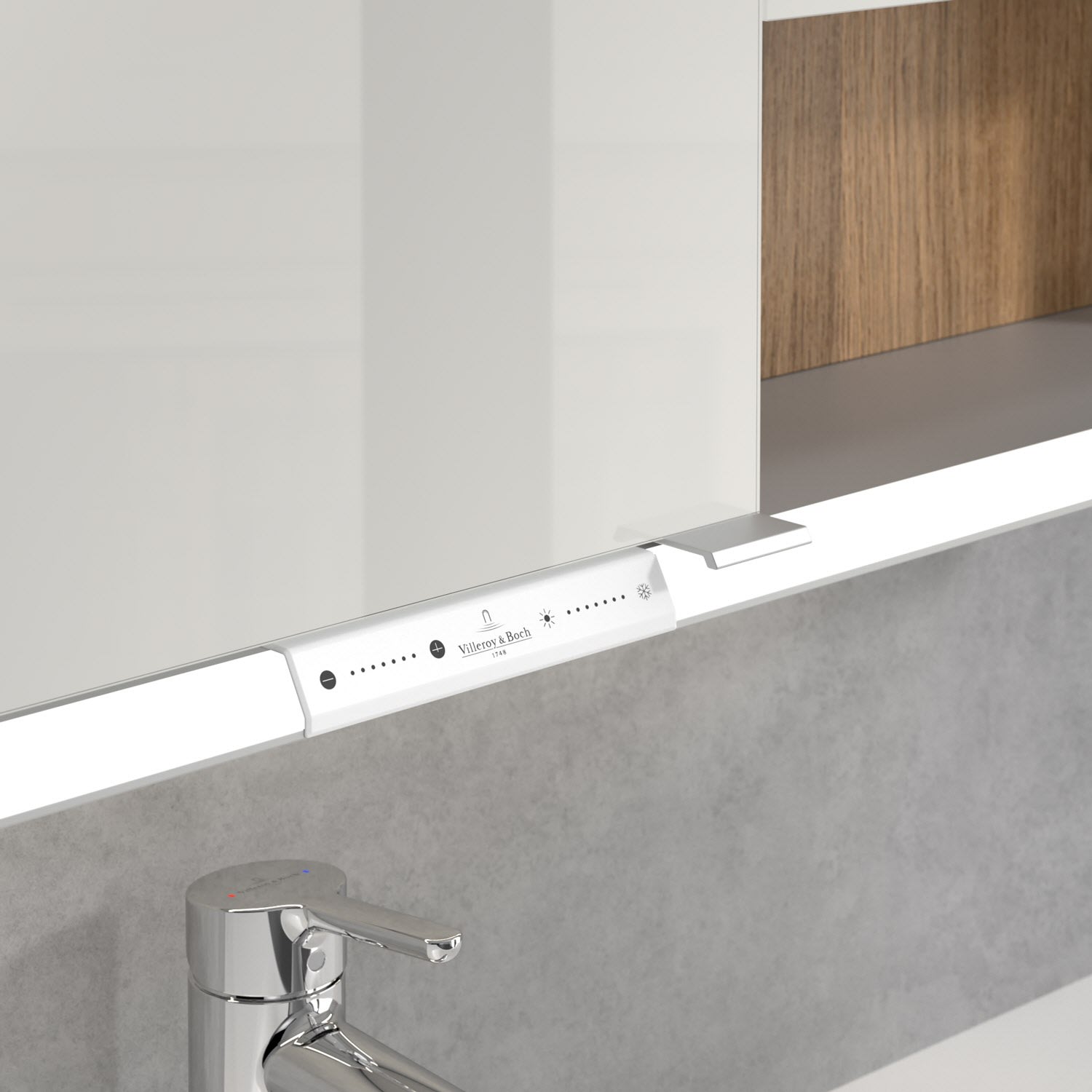 Das umlaufende LED-Lichtband sorgt für eine gleichmäßige Ausleuchtung, die integrierte Waschtischbeleuchtung und die beleuchteten offenen Fächer schaffen ein stimmungsvolles Ambiente. Helligkeit und Farbtemperatur lassen sich bequem per Sensor oder Smart-Home-Steuerung einstellen. Filigrane Griffe ermöglichen ein bequemes Öffnen der Türen ohne Fingerabdrücke, eine innenliegende Doppelsteckdose bietet zusätzliche Funktionalität.