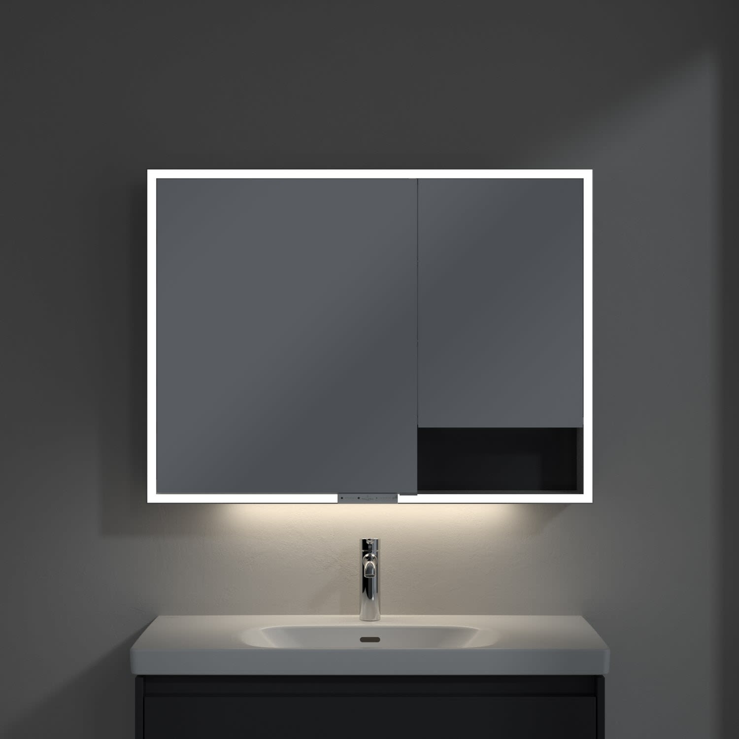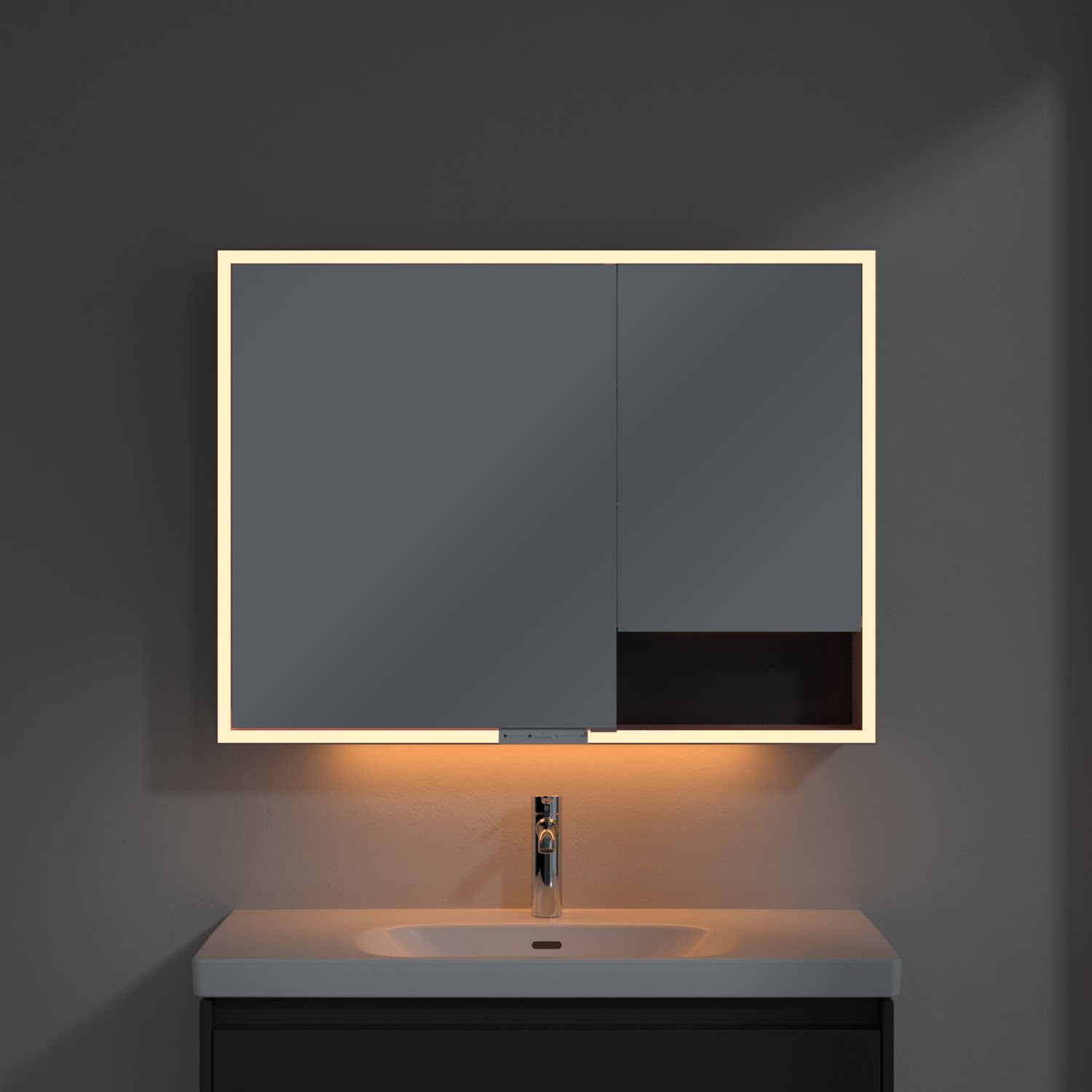 Das umlaufende LED-Lichtband sorgt für eine gleichmäßige Ausleuchtung, die integrierte Waschtischbeleuchtung und die beleuchteten offenen Fächer schaffen ein stimmungsvolles Ambiente. Helligkeit und Farbtemperatur lassen sich bequem per Sensor oder Smart-Home-Steuerung einstellen. Filigrane Griffe ermöglichen ein bequemes Öffnen der Türen ohne Fingerabdrücke, eine innenliegende Doppelsteckdose bietet zusätzliche Funktionalität.