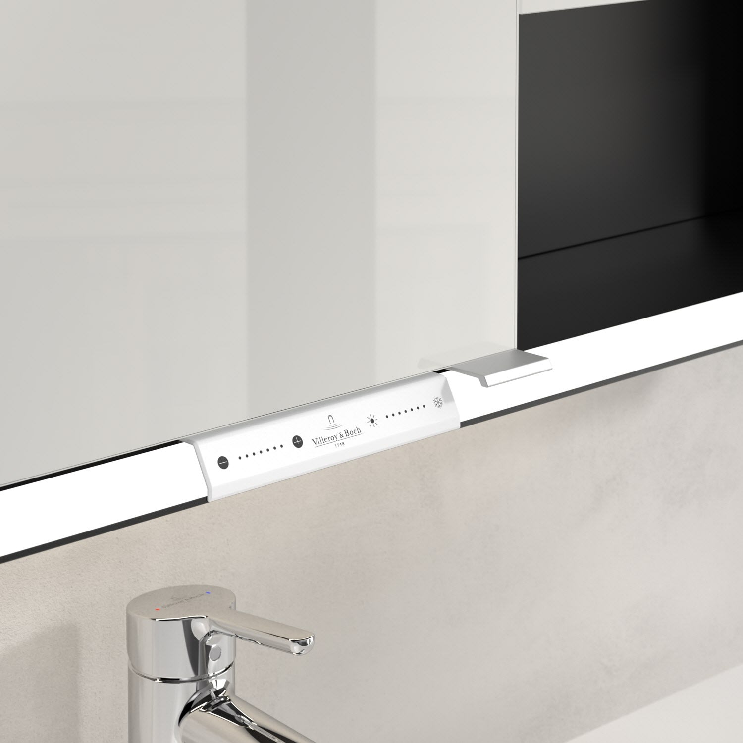 Das umlaufende LED-Lichtband sorgt für eine gleichmäßige Ausleuchtung, die integrierte Waschtischbeleuchtung und die beleuchteten offenen Fächer schaffen ein stimmungsvolles Ambiente. Helligkeit und Farbtemperatur lassen sich bequem per Sensor oder Smart-Home-Steuerung einstellen. Filigrane Griffe ermöglichen ein bequemes Öffnen der Türen ohne Fingerabdrücke, eine innenliegende Doppelsteckdose bietet zusätzliche Funktionalität.