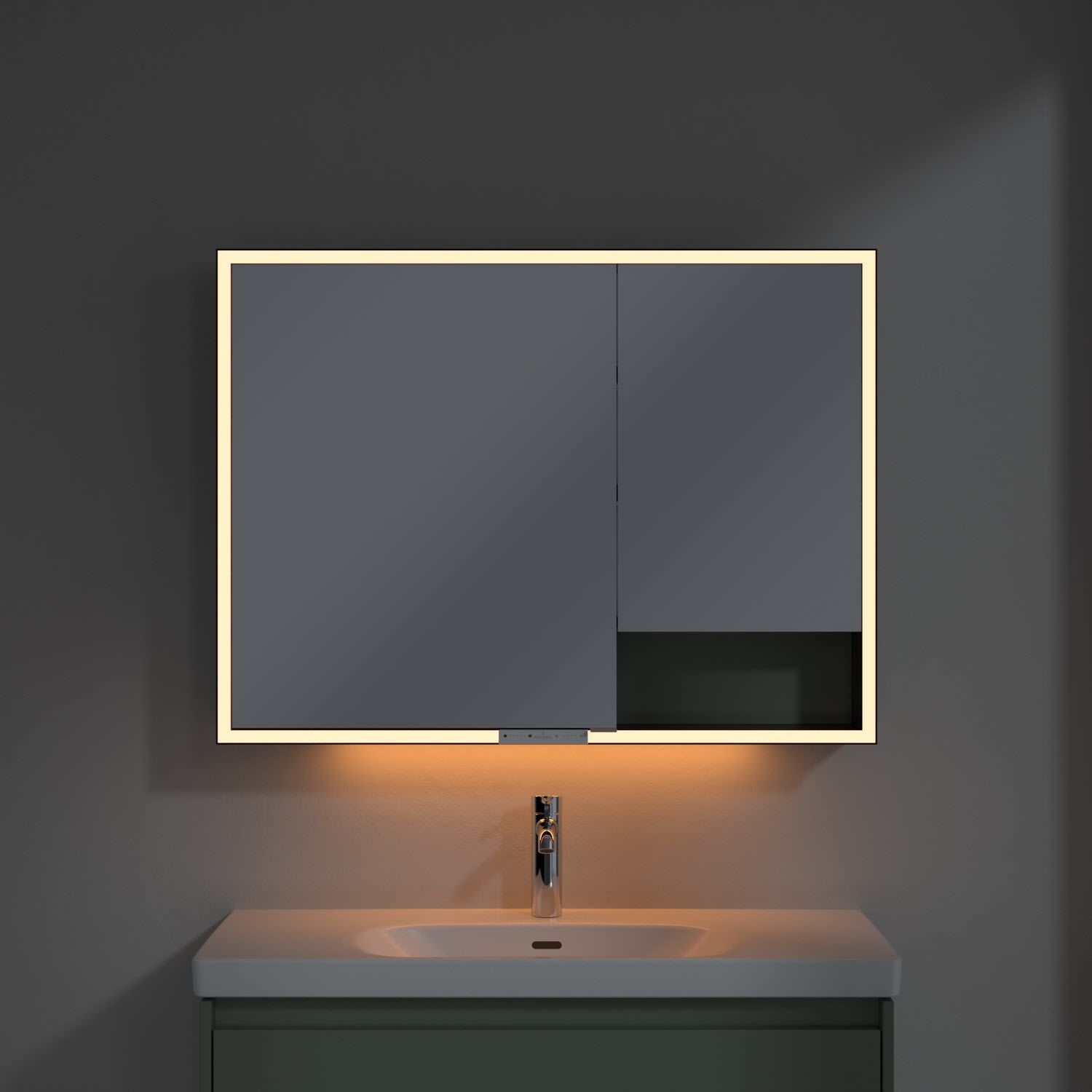Das umlaufende LED-Lichtband sorgt für eine gleichmäßige Ausleuchtung, die integrierte Waschtischbeleuchtung und die beleuchteten offenen Fächer schaffen ein stimmungsvolles Ambiente. Helligkeit und Farbtemperatur lassen sich bequem per Sensor oder Smart-Home-Steuerung einstellen. Filigrane Griffe ermöglichen ein bequemes Öffnen der Türen ohne Fingerabdrücke, eine innenliegende Doppelsteckdose bietet zusätzliche Funktionalität.