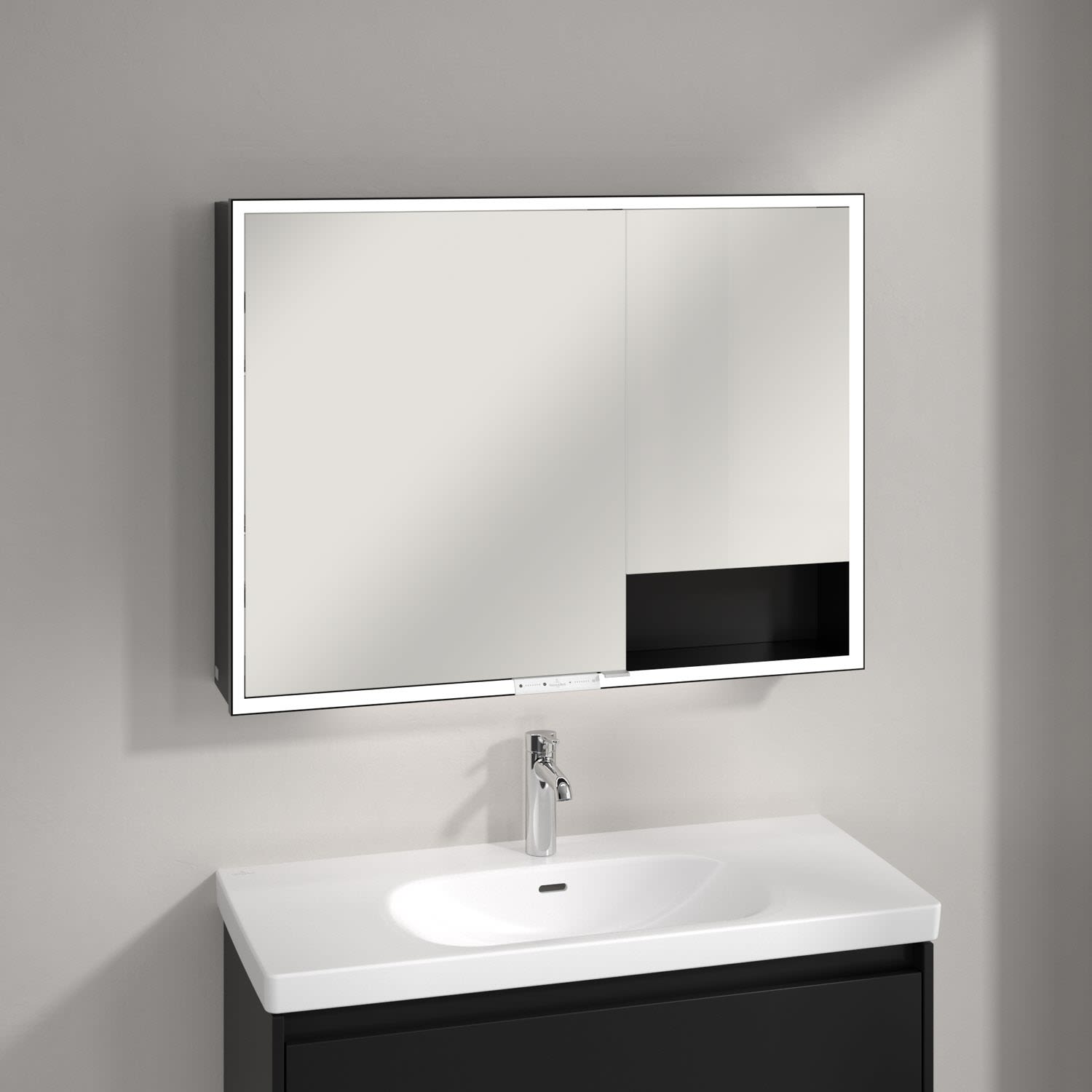 Durchdachtes Highlight für moderne Badgestaltung – Der My View+ Aufputz-Spiegelschrank von Villeroy & Boch bringt smarte Features und stilvolle Farbakzente ins Badezimmer und setzt neue Maßstäbe: mit geschlossenen und offenen Stauraumlösungen, einer farblich gestalteten Rückwand und dem sichtbaren Aluminiumkorpus in modernem Schwarz. So setzen Sie ein individuelles Farb- und Designstatement im Bad.