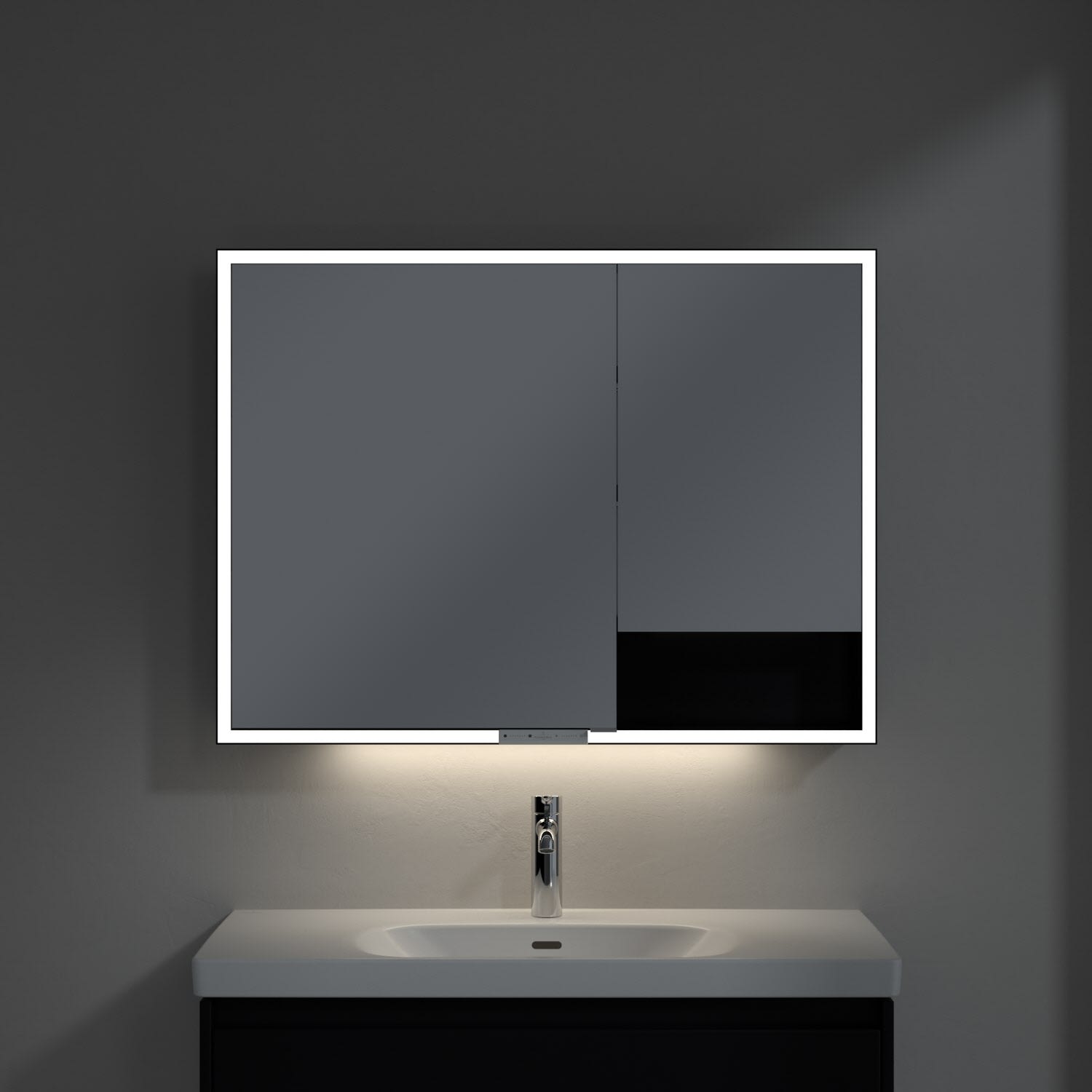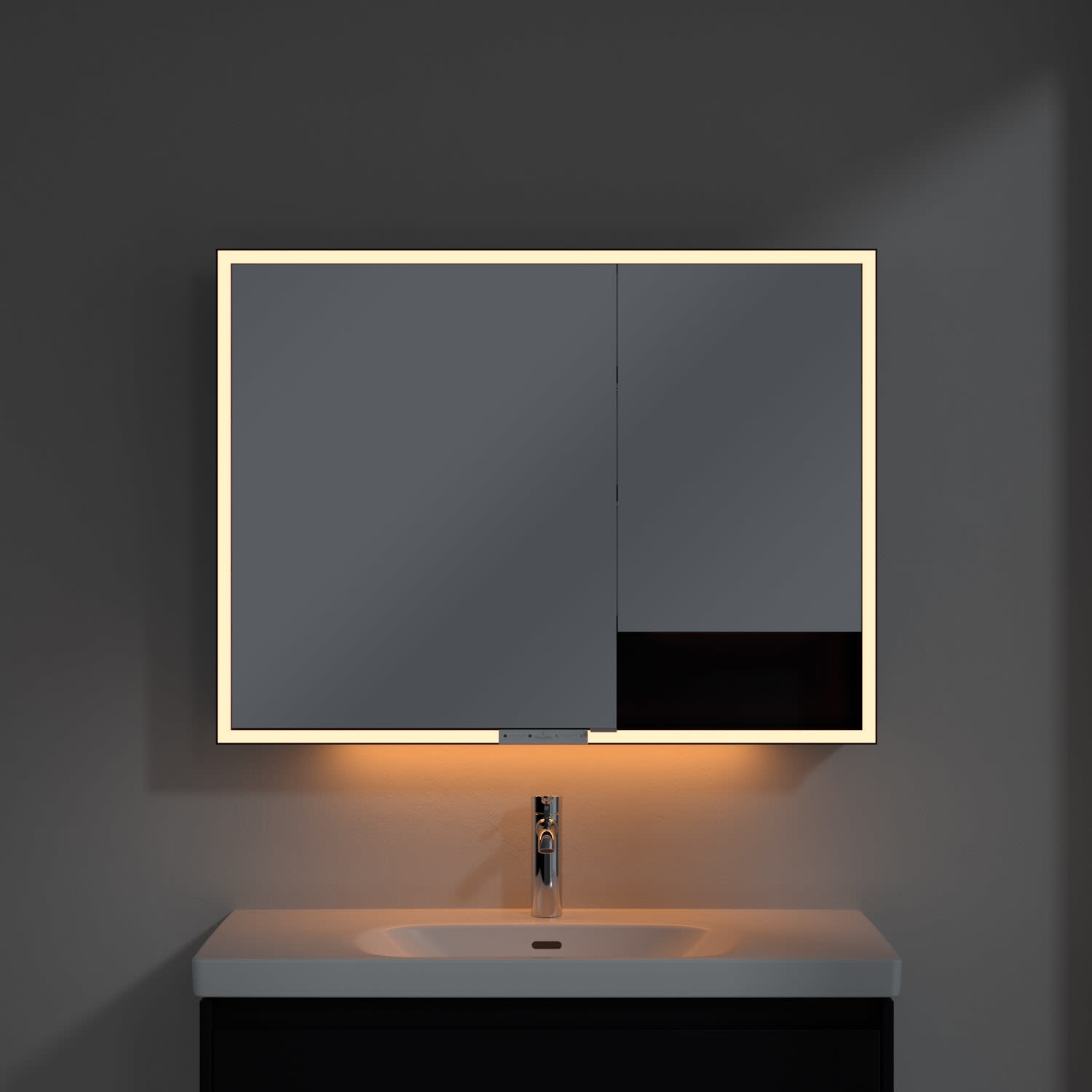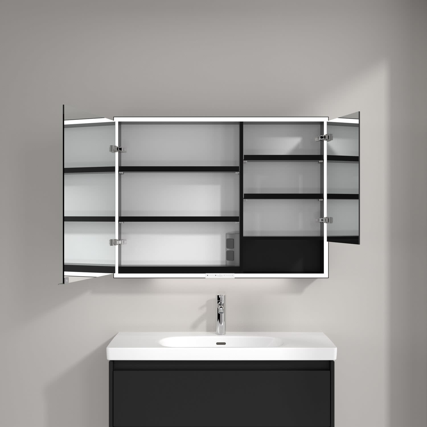 Das umlaufende LED-Lichtband sorgt für eine gleichmäßige Ausleuchtung, die integrierte Waschtischbeleuchtung und die beleuchteten offenen Fächer schaffen ein stimmungsvolles Ambiente. Helligkeit und Farbtemperatur lassen sich bequem per Sensor oder Smart-Home-Steuerung einstellen. Filigrane Griffe ermöglichen ein bequemes Öffnen der Türen ohne Fingerabdrücke, eine innenliegende Doppelsteckdose bietet zusätzliche Funktionalität.