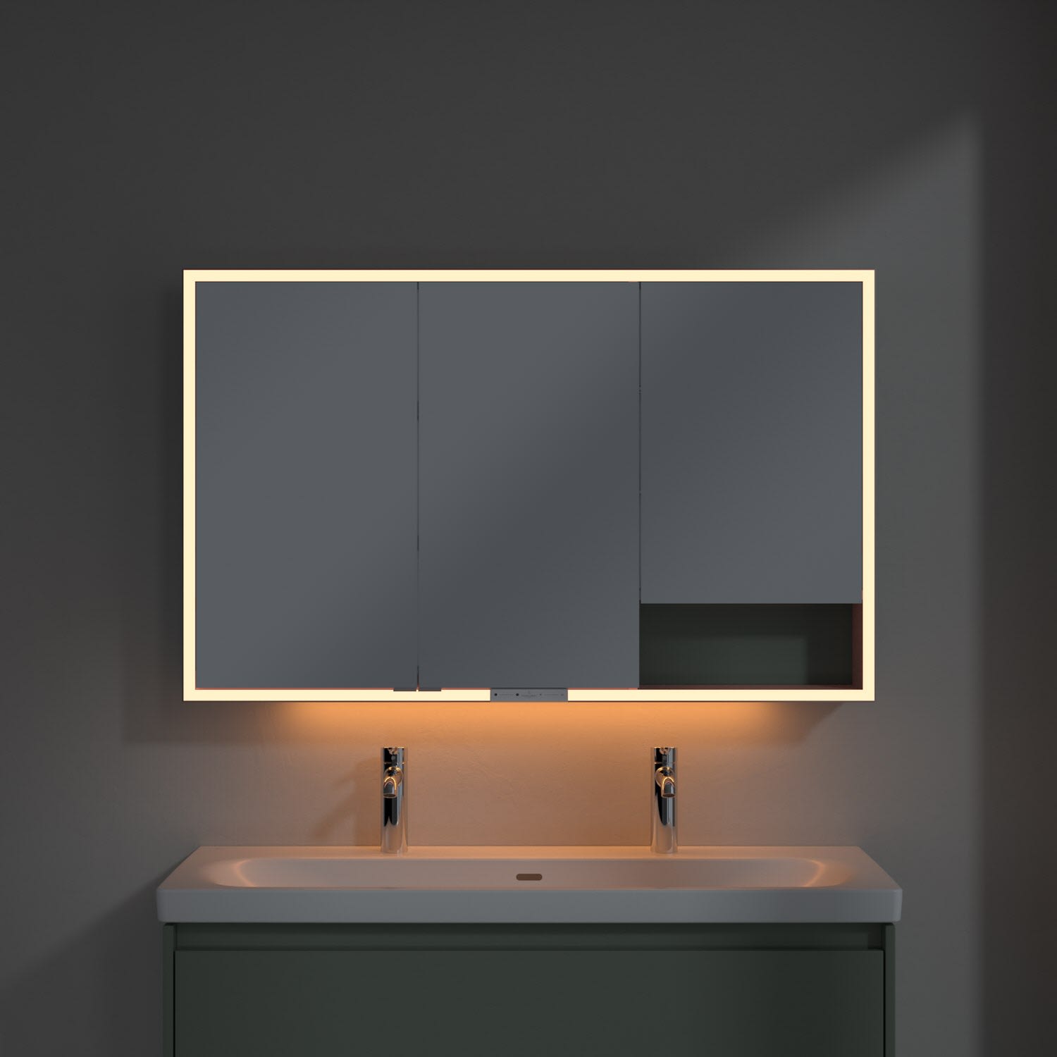 Das umlaufende LED-Lichtband sorgt für eine gleichmäßige Ausleuchtung, die integrierte Waschtischbeleuchtung und die beleuchteten offenen Fächer schaffen ein stimmungsvolles Ambiente. Helligkeit und Farbtemperatur lassen sich bequem per Sensor oder Smart-Home-Steuerung einstellen. Filigrane Griffe ermöglichen ein bequemes Öffnen der Türen ohne Fingerabdrücke, eine innenliegende Doppelsteckdose bietet zusätzliche Funktionalität.