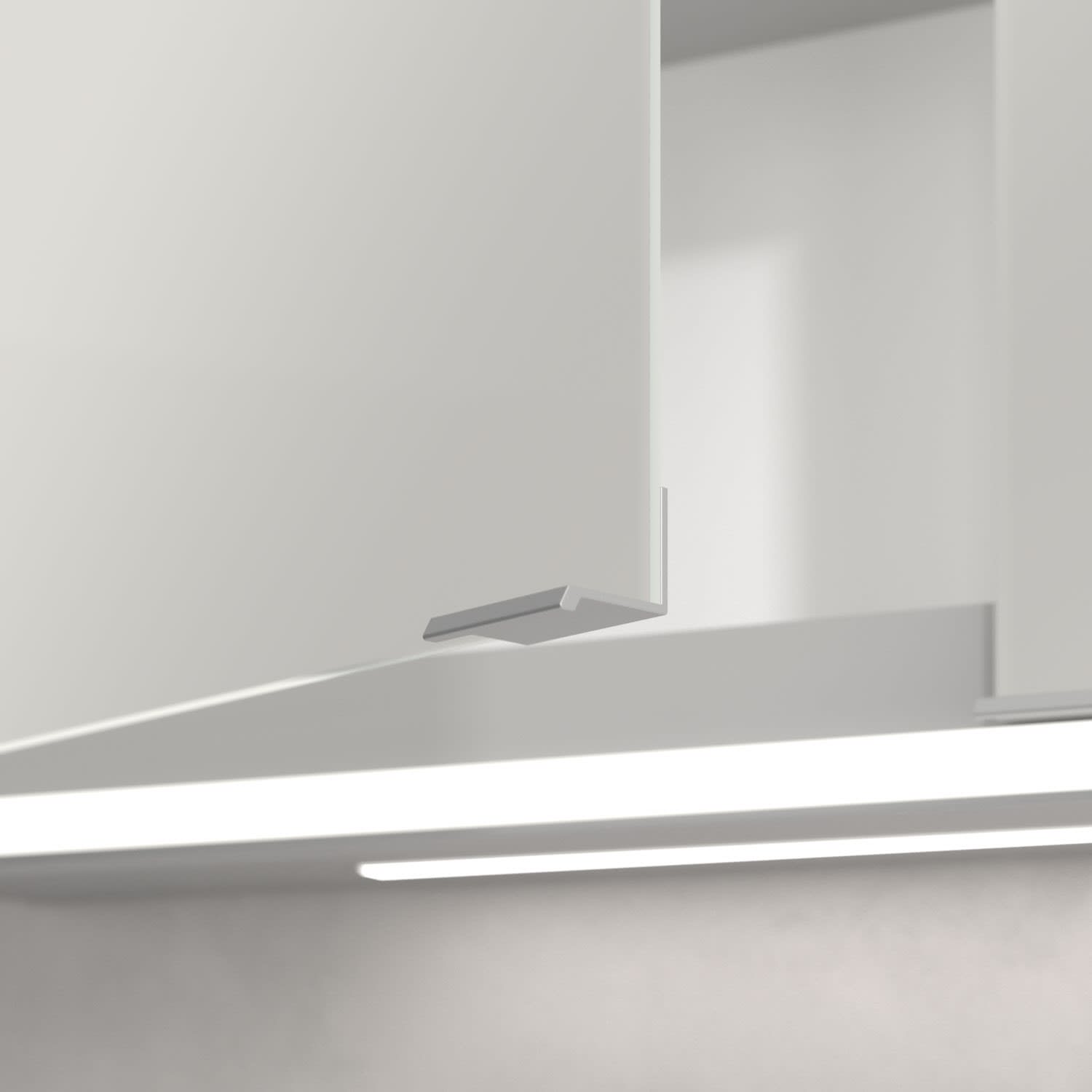 Das umlaufende LED-Lichtband sorgt für eine gleichmäßige Ausleuchtung, die integrierte Waschtischbeleuchtung und die beleuchteten offenen Fächer schaffen ein stimmungsvolles Ambiente. Helligkeit und Farbtemperatur lassen sich bequem per Sensor oder Smart-Home-Steuerung einstellen. Filigrane Griffe ermöglichen ein bequemes Öffnen der Türen ohne Fingerabdrücke, eine innenliegende Doppelsteckdose bietet zusätzliche Funktionalität.