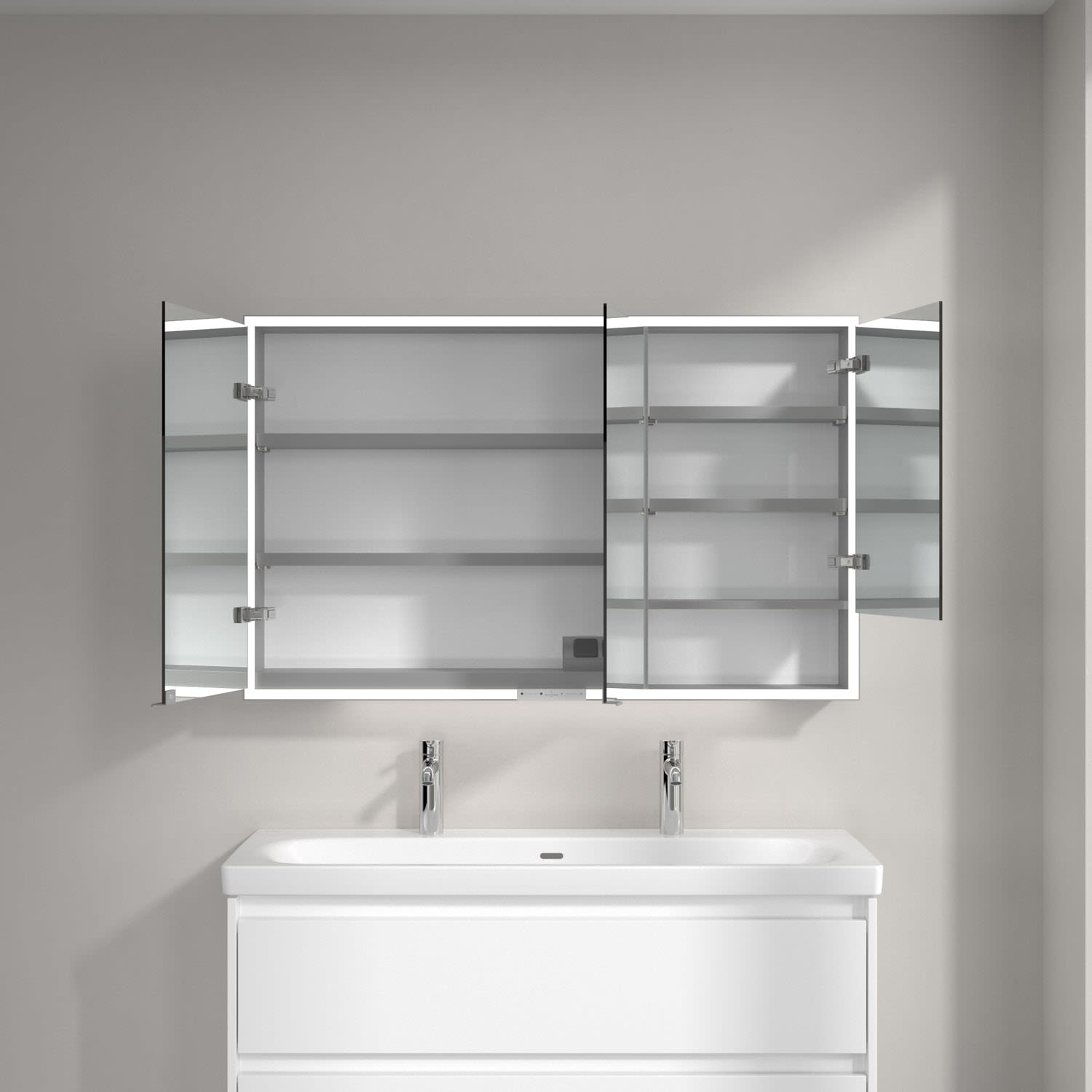 Das umlaufende LED-Lichtband sorgt für eine gleichmäßige Ausleuchtung, die integrierte Waschtischbeleuchtung und die beleuchteten offenen Fächer schaffen ein stimmungsvolles Ambiente. Helligkeit und Farbtemperatur lassen sich bequem per Sensor oder Smart-Home-Steuerung einstellen. Filigrane Griffe ermöglichen ein bequemes Öffnen der Türen ohne Fingerabdrücke, eine innenliegende Doppelsteckdose bietet zusätzliche Funktionalität.