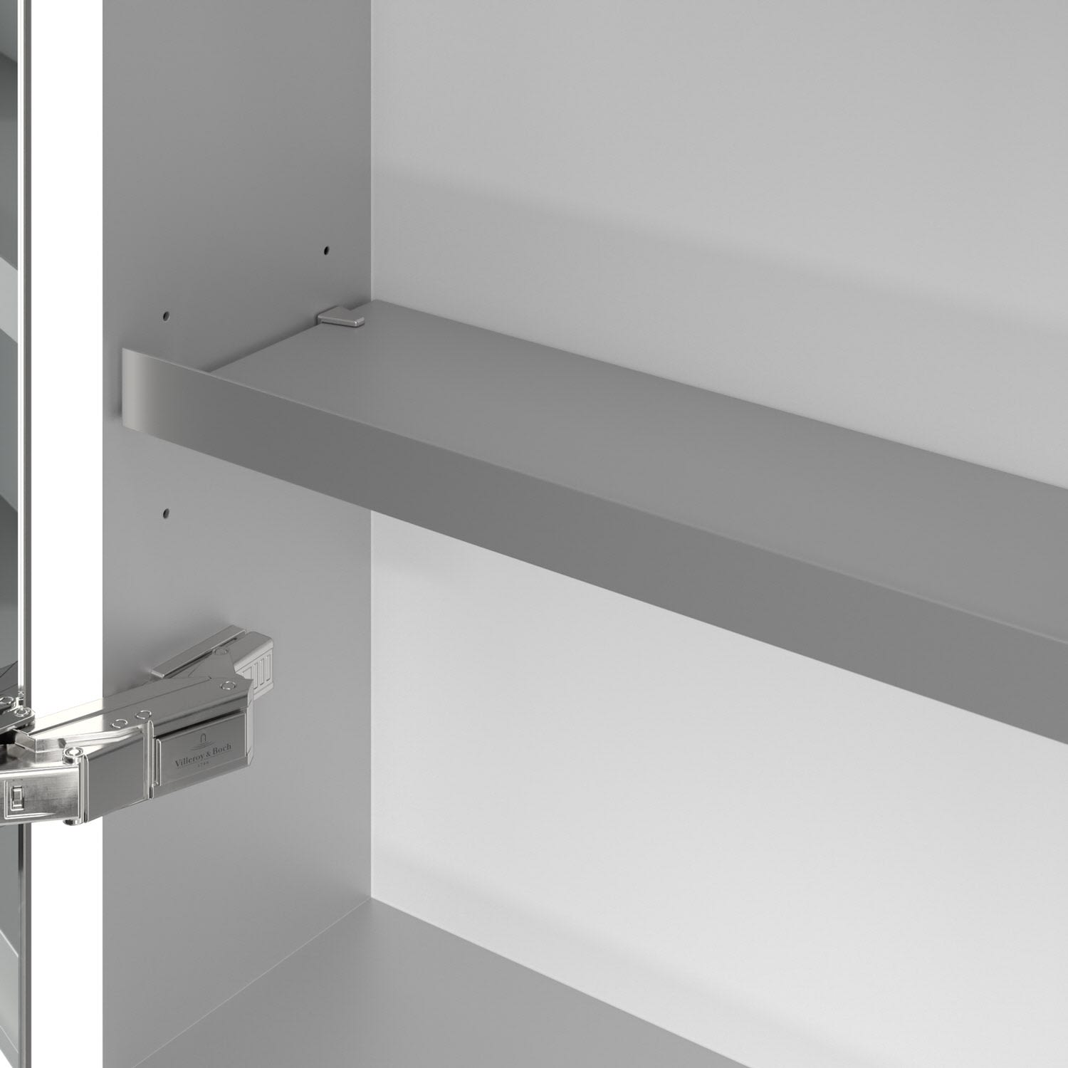 - praktische Extras: Aluminiumeinlegeböden mit praktischem Kippschutz, Vergrößerungsspiegel & Magnetleiste