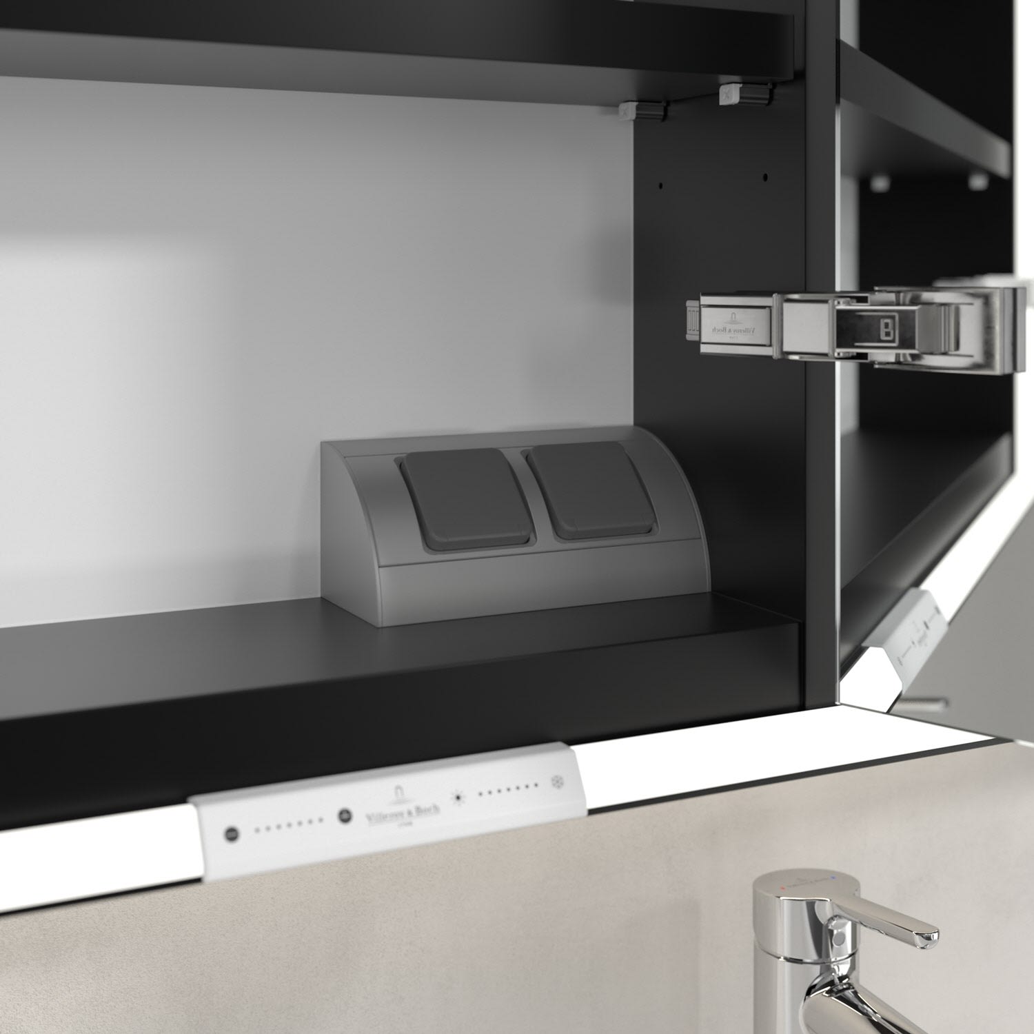 Das umlaufende LED-Lichtband sorgt für eine gleichmäßige Ausleuchtung, die integrierte Waschtischbeleuchtung und die beleuchteten offenen Fächer schaffen ein stimmungsvolles Ambiente. Helligkeit und Farbtemperatur lassen sich bequem per Sensor oder Smart-Home-Steuerung einstellen. Filigrane Griffe ermöglichen ein bequemes Öffnen der Türen ohne Fingerabdrücke, eine innenliegende Doppelsteckdose bietet zusätzliche Funktionalität.