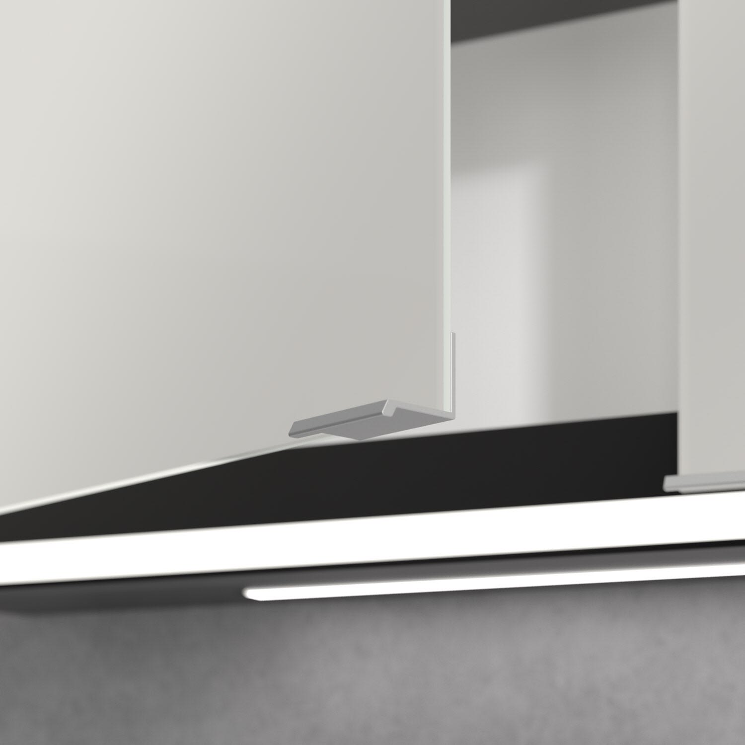 Das umlaufende LED-Lichtband sorgt für eine gleichmäßige Ausleuchtung, die integrierte Waschtischbeleuchtung und die beleuchteten offenen Fächer schaffen ein stimmungsvolles Ambiente. Helligkeit und Farbtemperatur lassen sich bequem per Sensor oder Smart-Home-Steuerung einstellen. Filigrane Griffe ermöglichen ein bequemes Öffnen der Türen ohne Fingerabdrücke, eine innenliegende Doppelsteckdose bietet zusätzliche Funktionalität.
