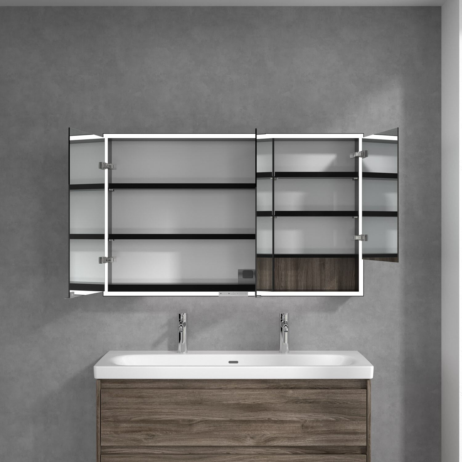 Das umlaufende LED-Lichtband sorgt für eine gleichmäßige Ausleuchtung, die integrierte Waschtischbeleuchtung und die beleuchteten offenen Fächer schaffen ein stimmungsvolles Ambiente. Helligkeit und Farbtemperatur lassen sich bequem per Sensor oder Smart-Home-Steuerung einstellen. Filigrane Griffe ermöglichen ein bequemes Öffnen der Türen ohne Fingerabdrücke, eine innenliegende Doppelsteckdose bietet zusätzliche Funktionalität.