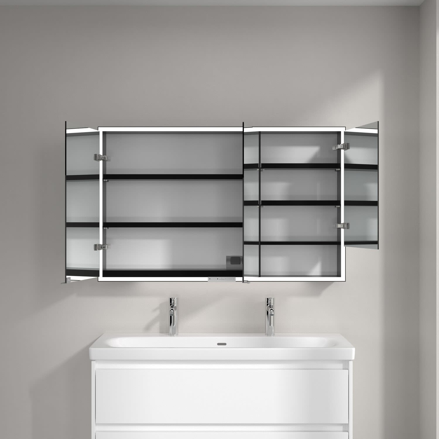 Das umlaufende LED-Lichtband sorgt für eine gleichmäßige Ausleuchtung, die integrierte Waschtischbeleuchtung und die beleuchteten offenen Fächer schaffen ein stimmungsvolles Ambiente. Helligkeit und Farbtemperatur lassen sich bequem per Sensor oder Smart-Home-Steuerung einstellen. Filigrane Griffe ermöglichen ein bequemes Öffnen der Türen ohne Fingerabdrücke, eine innenliegende Doppelsteckdose bietet zusätzliche Funktionalität.