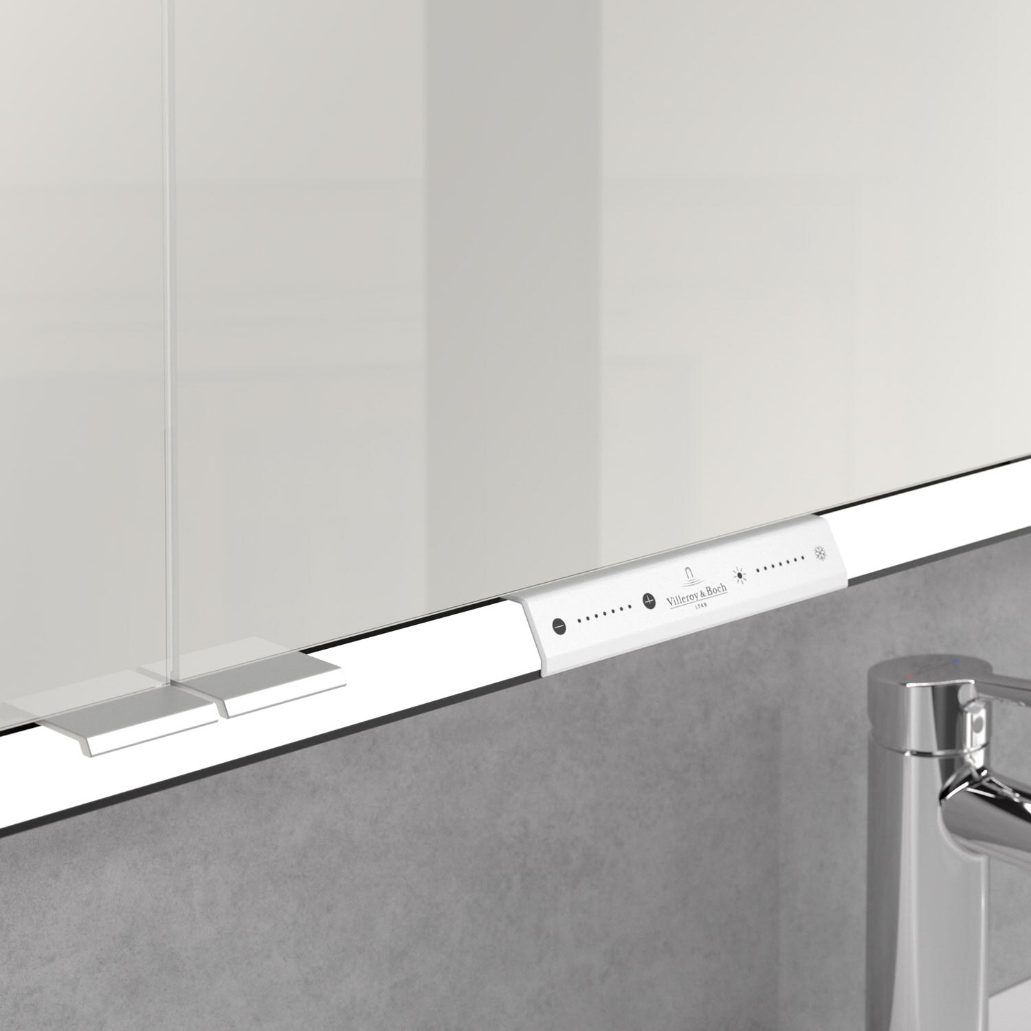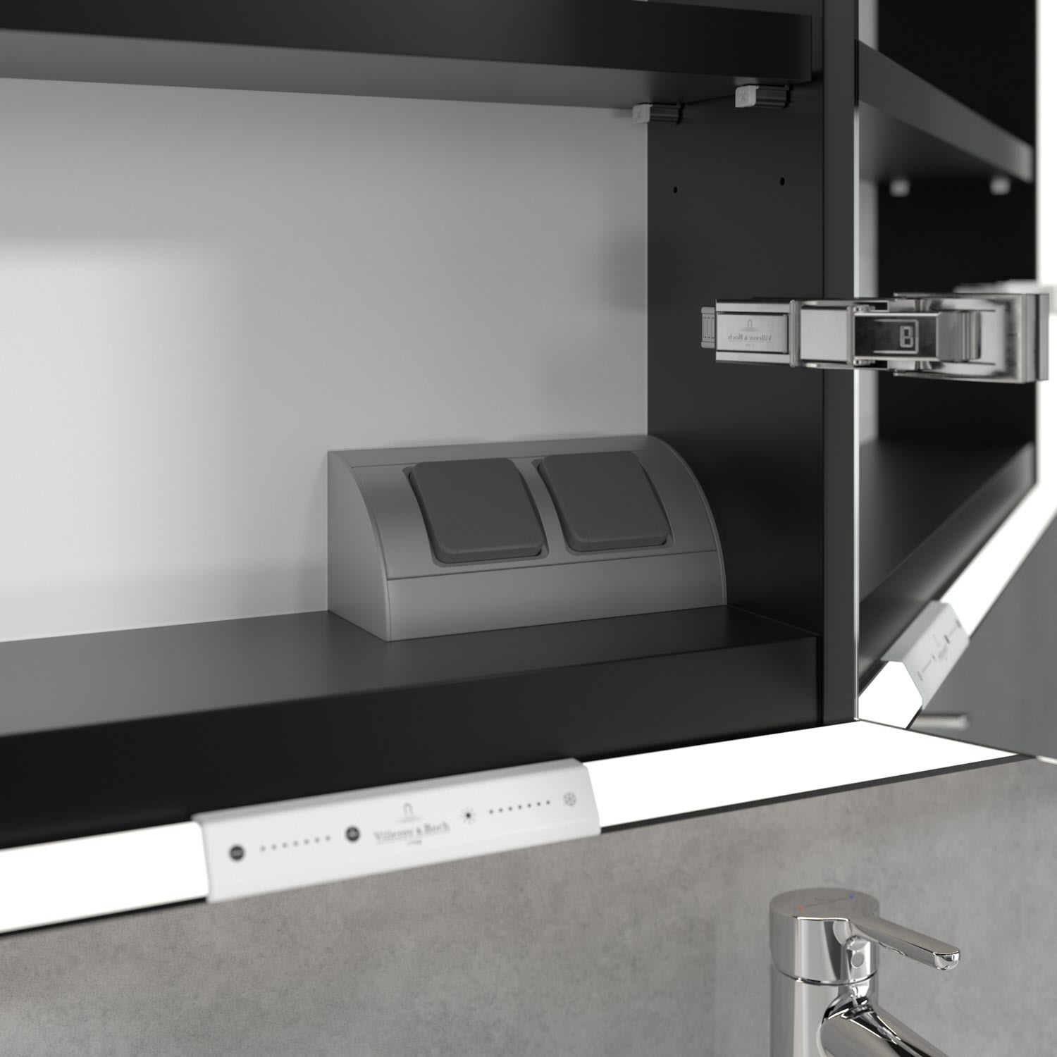Das umlaufende LED-Lichtband sorgt für eine gleichmäßige Ausleuchtung, die integrierte Waschtischbeleuchtung und die beleuchteten offenen Fächer schaffen ein stimmungsvolles Ambiente. Helligkeit und Farbtemperatur lassen sich bequem per Sensor oder Smart-Home-Steuerung einstellen. Filigrane Griffe ermöglichen ein bequemes Öffnen der Türen ohne Fingerabdrücke, eine innenliegende Doppelsteckdose bietet zusätzliche Funktionalität.