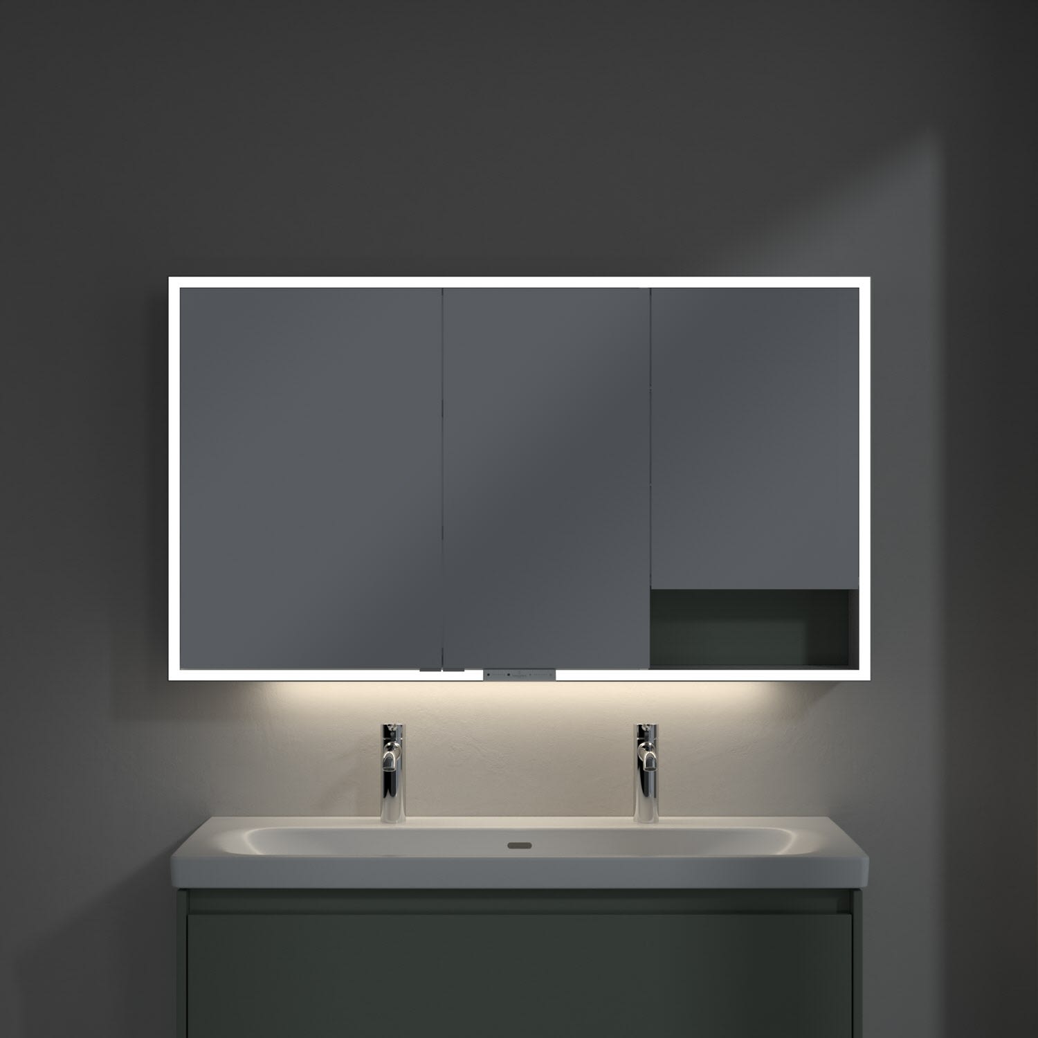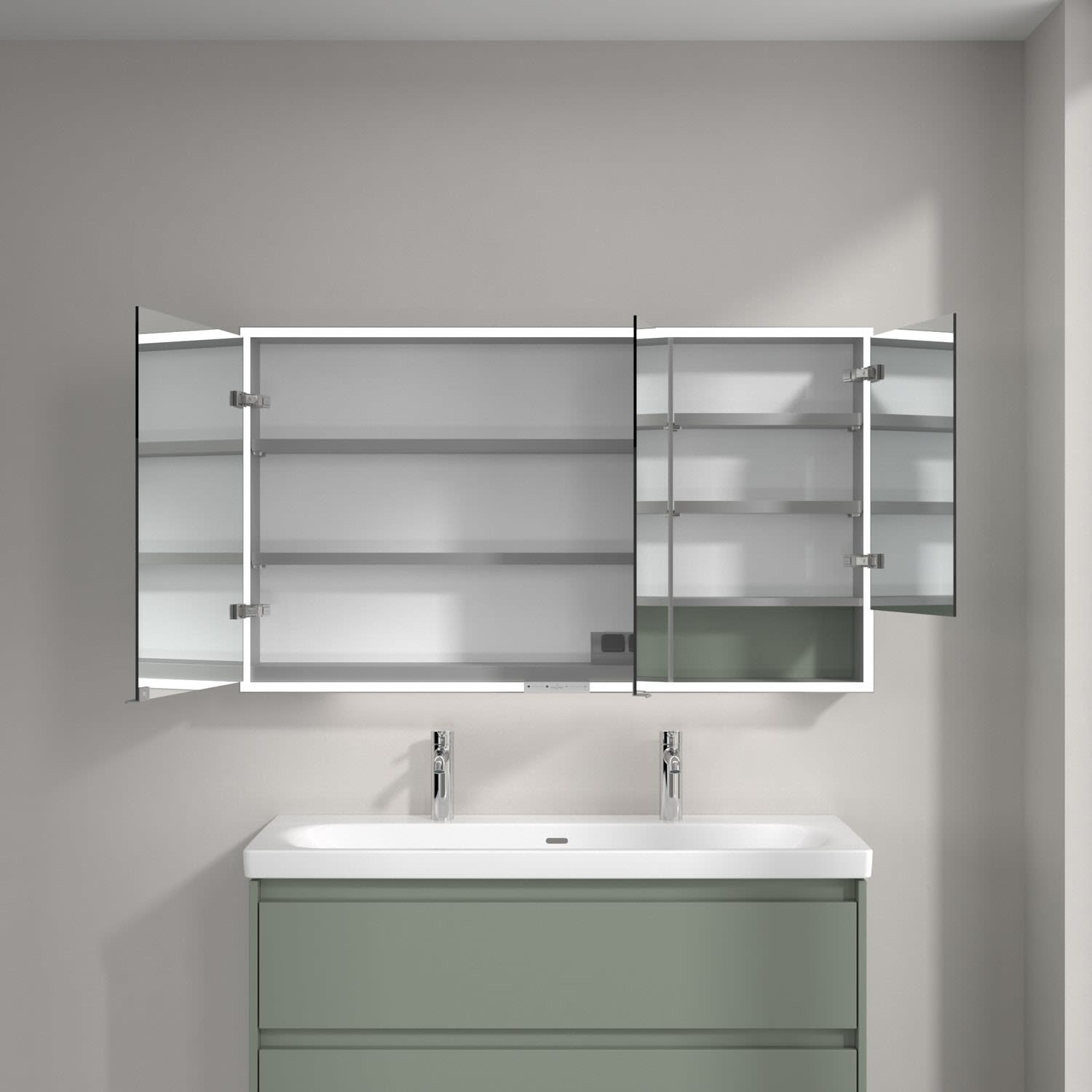 Das umlaufende LED-Lichtband sorgt für eine gleichmäßige Ausleuchtung, die integrierte Waschtischbeleuchtung und die beleuchteten offenen Fächer schaffen ein stimmungsvolles Ambiente. Helligkeit und Farbtemperatur lassen sich bequem per Sensor oder Smart-Home-Steuerung einstellen. Filigrane Griffe ermöglichen ein bequemes Öffnen der Türen ohne Fingerabdrücke, eine innenliegende Doppelsteckdose bietet zusätzliche Funktionalität.