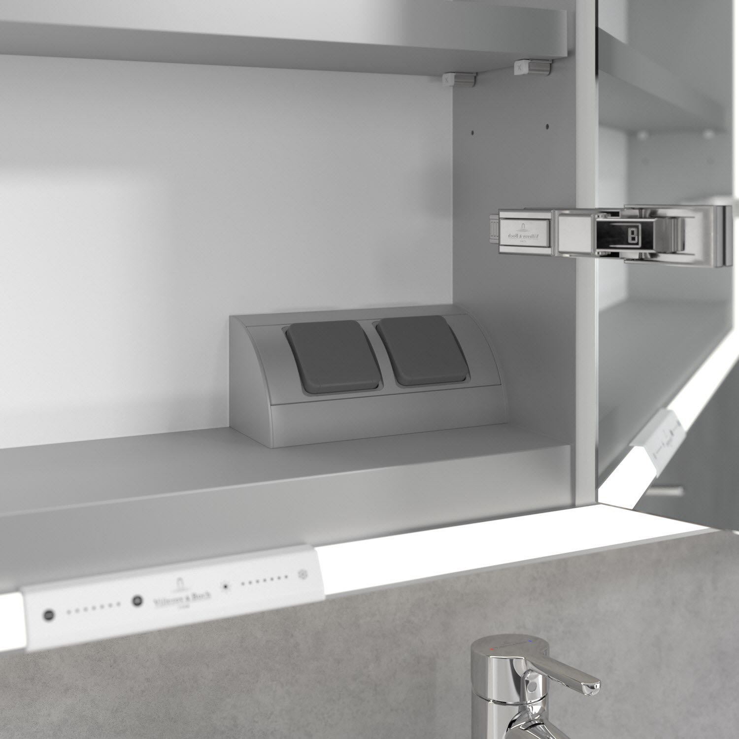Das umlaufende LED-Lichtband sorgt für eine gleichmäßige Ausleuchtung, die integrierte Waschtischbeleuchtung und die beleuchteten offenen Fächer schaffen ein stimmungsvolles Ambiente. Helligkeit und Farbtemperatur lassen sich bequem per Sensor oder Smart-Home-Steuerung einstellen. Filigrane Griffe ermöglichen ein bequemes Öffnen der Türen ohne Fingerabdrücke, eine innenliegende Doppelsteckdose bietet zusätzliche Funktionalität.