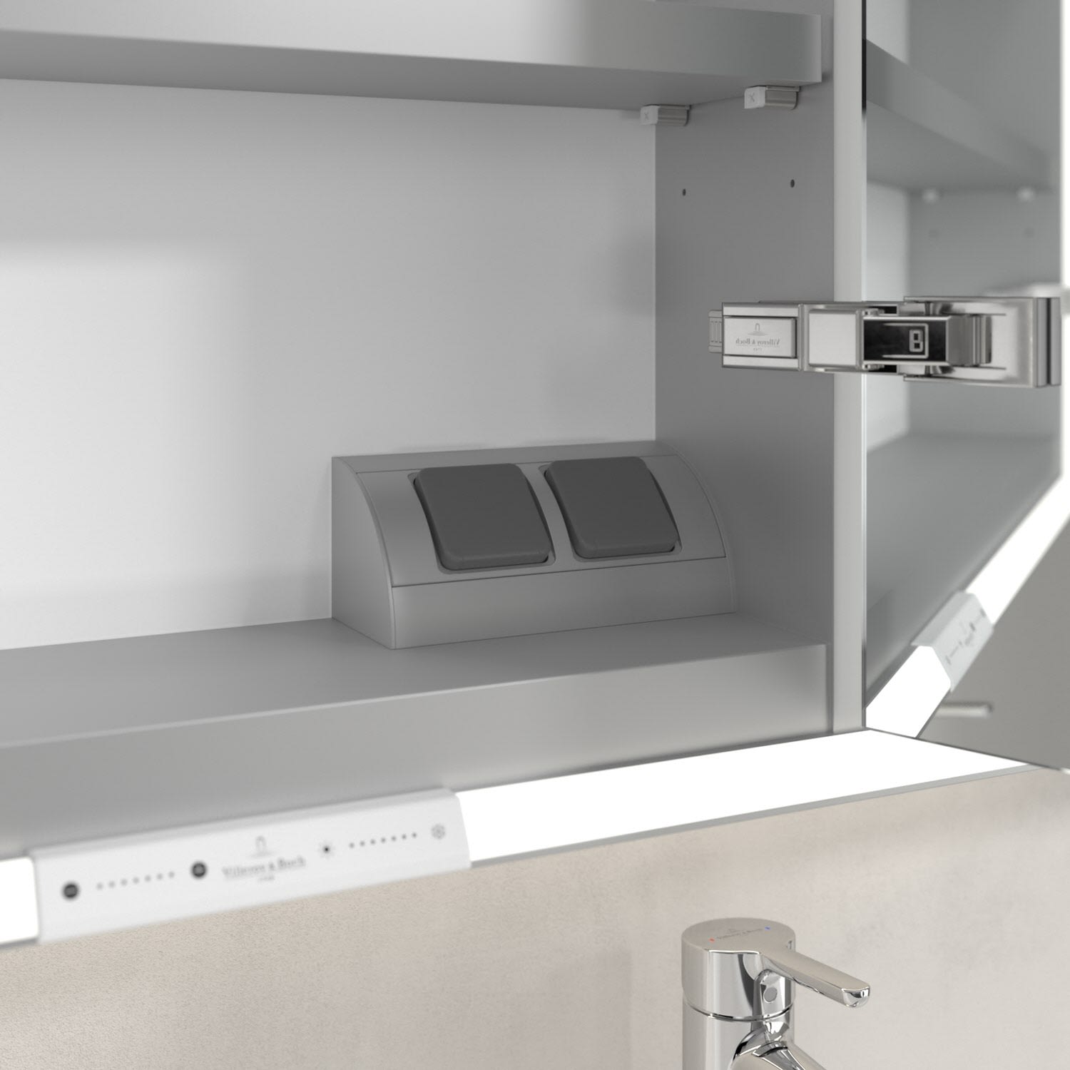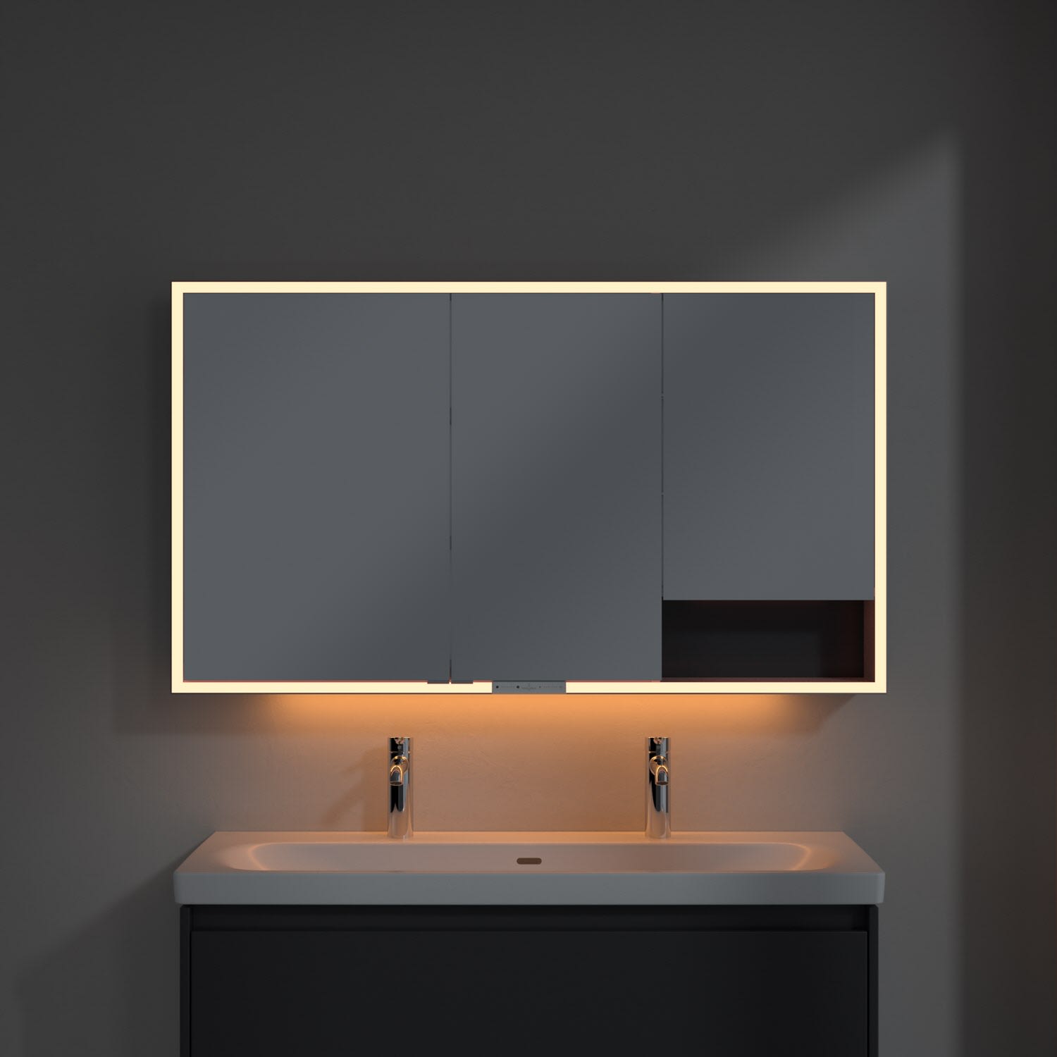 Das umlaufende LED-Lichtband sorgt für eine gleichmäßige Ausleuchtung, die integrierte Waschtischbeleuchtung und die beleuchteten offenen Fächer schaffen ein stimmungsvolles Ambiente. Helligkeit und Farbtemperatur lassen sich bequem per Sensor oder Smart-Home-Steuerung einstellen. Filigrane Griffe ermöglichen ein bequemes Öffnen der Türen ohne Fingerabdrücke, eine innenliegende Doppelsteckdose bietet zusätzliche Funktionalität.