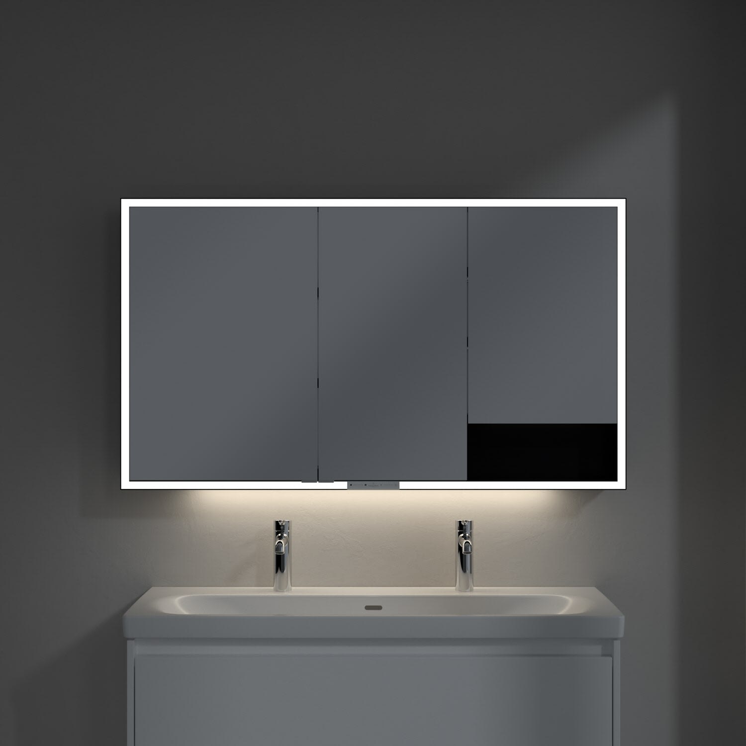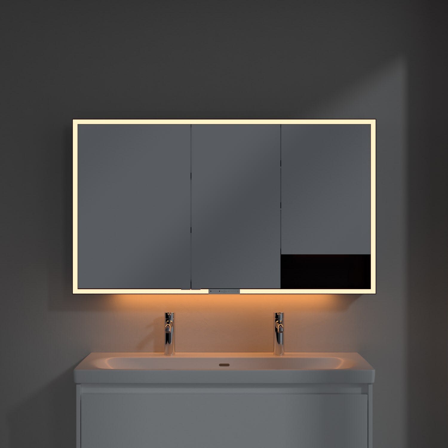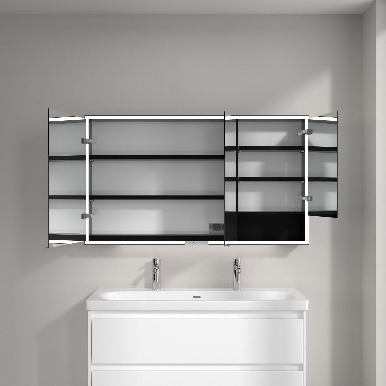 Das umlaufende LED-Lichtband sorgt für eine gleichmäßige Ausleuchtung, die integrierte Waschtischbeleuchtung und die beleuchteten offenen Fächer schaffen ein stimmungsvolles Ambiente. Helligkeit und Farbtemperatur lassen sich bequem per Sensor oder Smart-Home-Steuerung einstellen. Filigrane Griffe ermöglichen ein bequemes Öffnen der Türen ohne Fingerabdrücke, eine innenliegende Doppelsteckdose bietet zusätzliche Funktionalität.