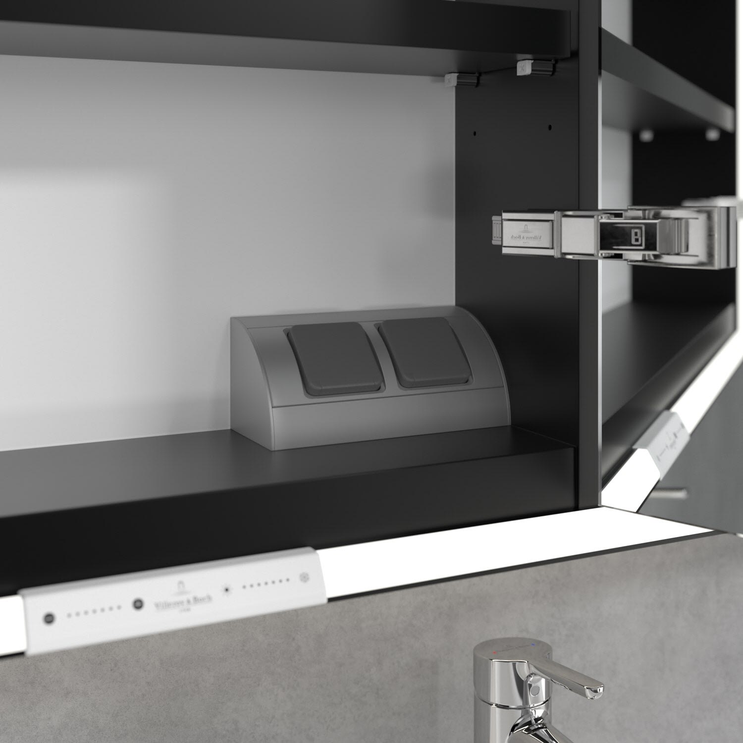 Das umlaufende LED-Lichtband sorgt für eine gleichmäßige Ausleuchtung, die integrierte Waschtischbeleuchtung und die beleuchteten offenen Fächer schaffen ein stimmungsvolles Ambiente. Helligkeit und Farbtemperatur lassen sich bequem per Sensor oder Smart-Home-Steuerung einstellen. Filigrane Griffe ermöglichen ein bequemes Öffnen der Türen ohne Fingerabdrücke, eine innenliegende Doppelsteckdose bietet zusätzliche Funktionalität.